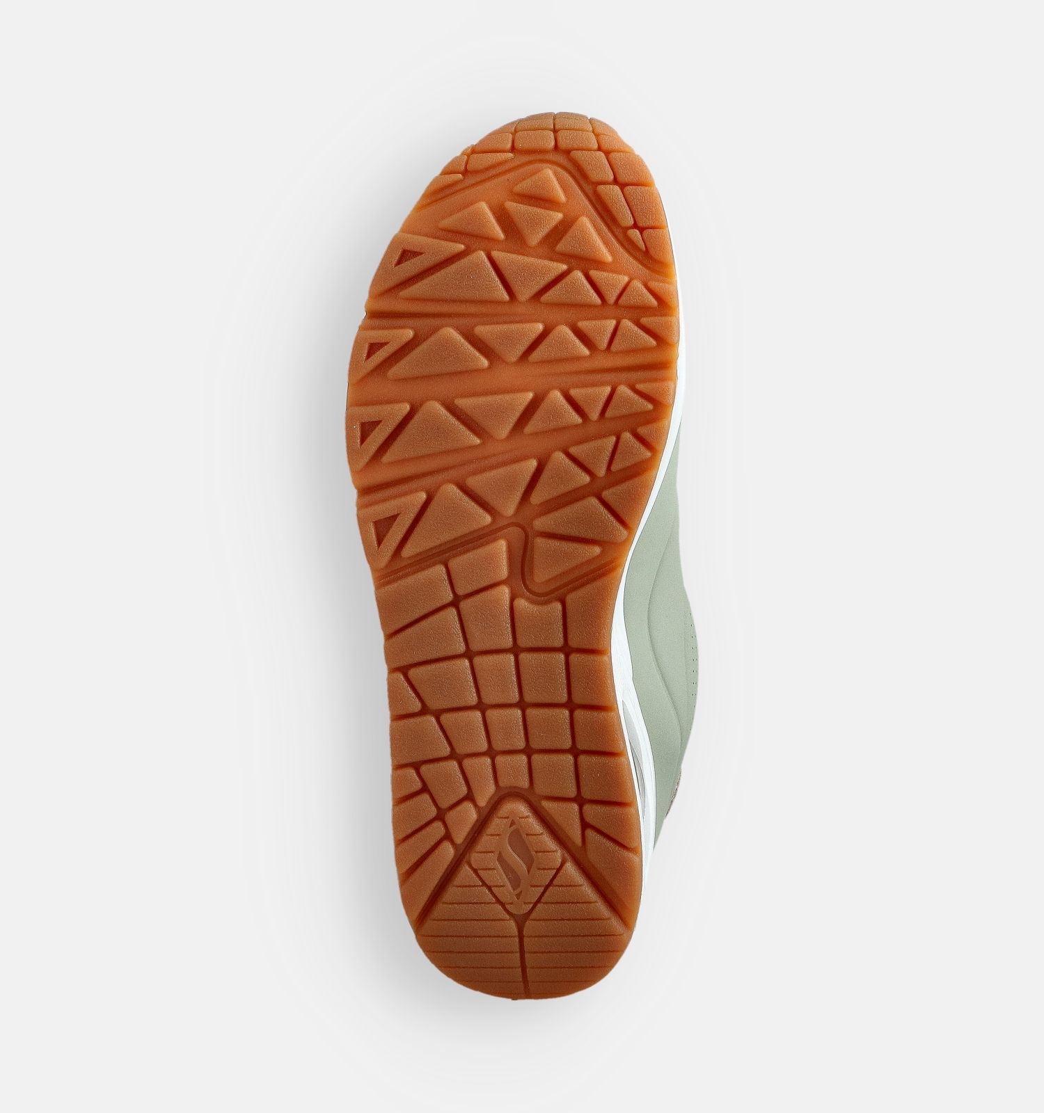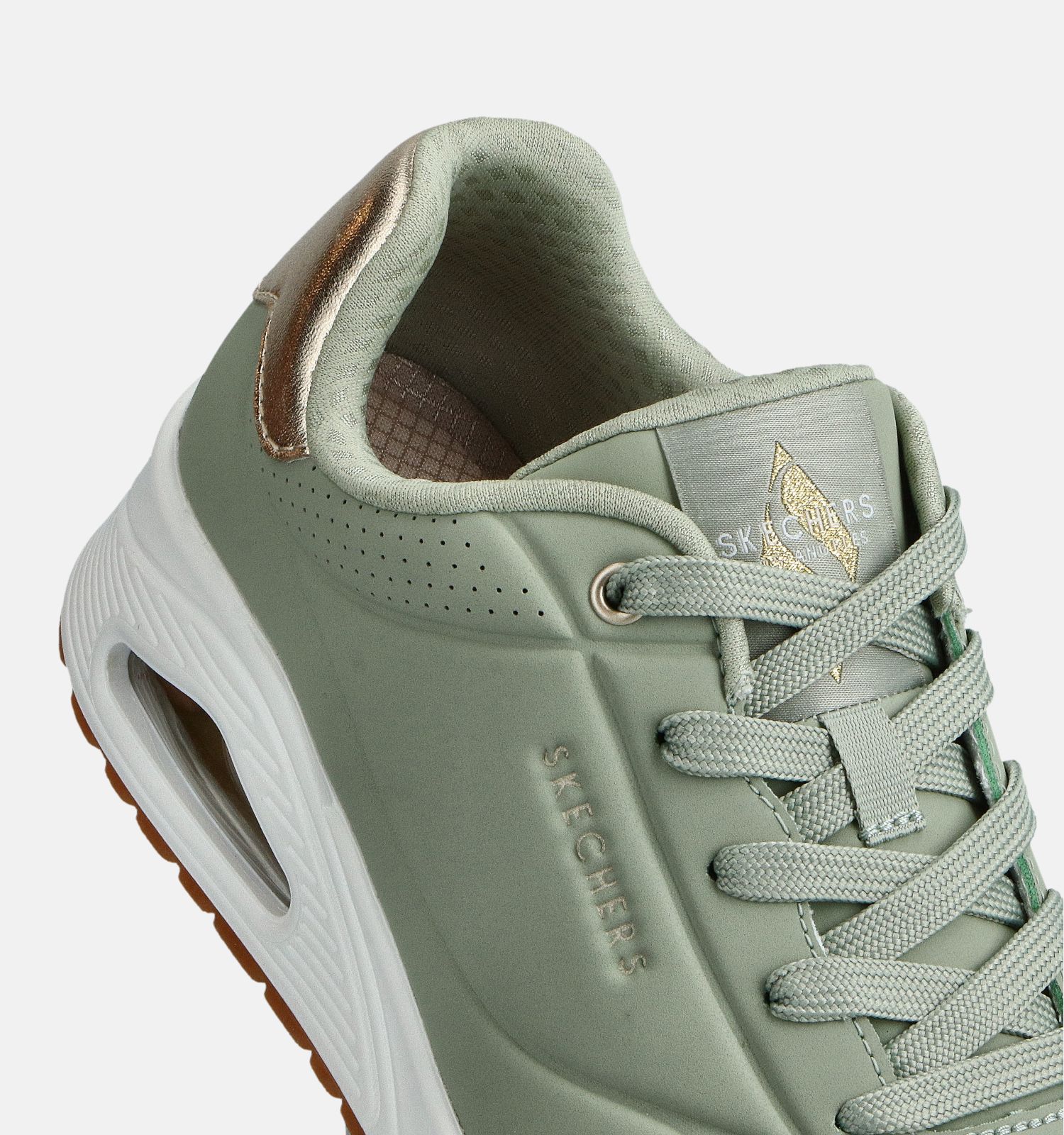 Bon à savoir pour l'entretien : l'intérieur de ces Skechers Memory Foam, Uno pour femmes est fabriqué en textile et l'extérieur se compose de simili cuir renforcé. Ce modèle en vert possède une fermeture lacets.
