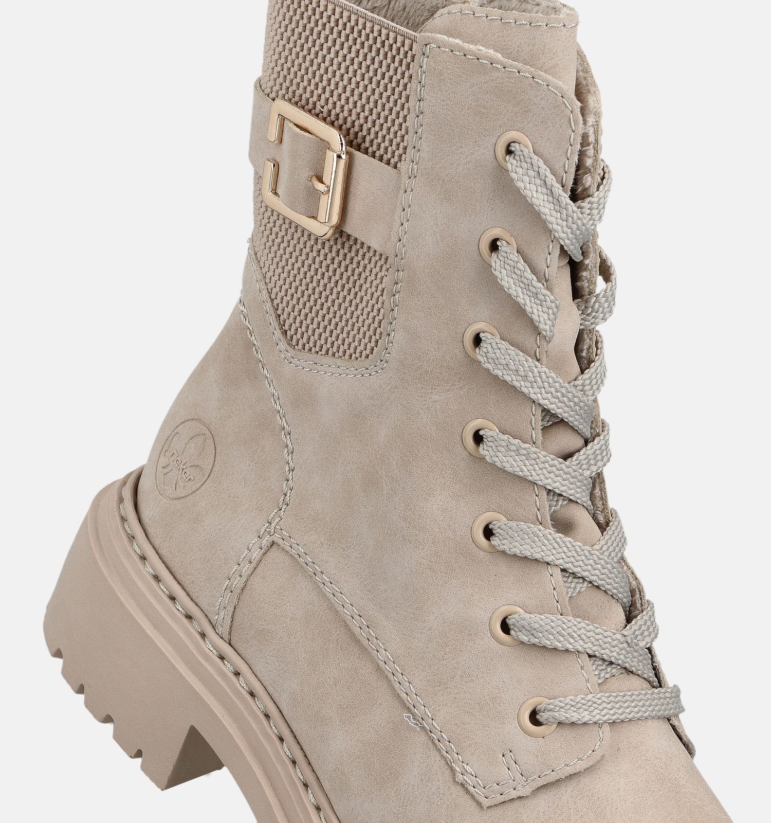 Ces boots en beige sont fabriqué(e)s en simili cuir robuste et en textile souple à l'intérieur. Ces matériaux sont particulièrement légers, un antidote à la sensation reconnaissable de pieds lourds présente après un certain temps. La coupe ergonomique de ces boots Rieker pour femmes tient aussi compte du léger gonflement de tous les pieds en fin de journée. Ainsi, vous baignez dans un confort optimal toute la journée ! Ces boots Rieker pour femmes possède(e)s une fermeture fermeture éclair & lacets.