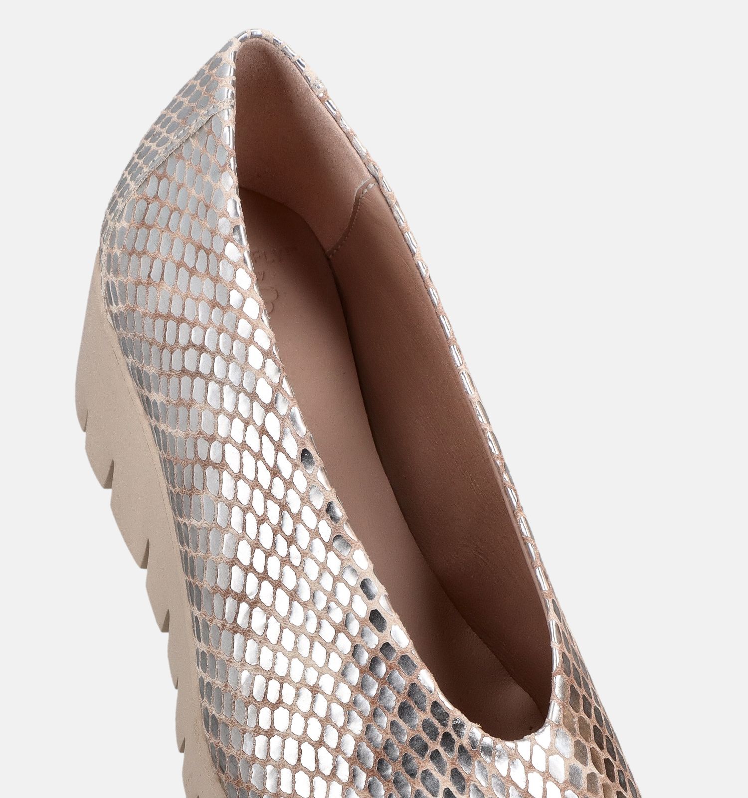 Ces escarpins en or de la marque Wonders sont dotés d’un talon compensé (également appelé wedge) : une forme de talon continue, inclinée du talon jusqu’aux orteils — plus haut à l’arrière, plus bas à l’avant.