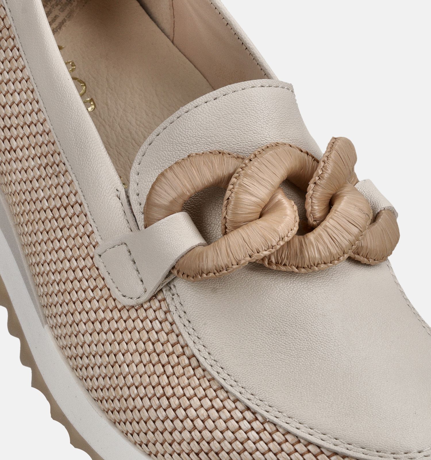 Ces chaussures pour femmes Gabor sont sans nickel, donc ces chaussures plates en beige conviennent également aux dames souffrant d'une allergie de contact au nickel. La ligne est à base d'eau. Il est important de noter que ces chaussures plates de Gabor ont comme largeur f - semelle normale. Ces chaussures plates en beige sont fabriquées en cuir, raphia, simili cuir, textile résistant, avec une finition intérieure en cuir, textile.