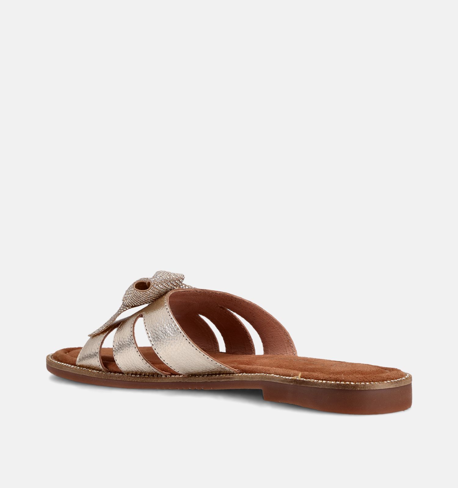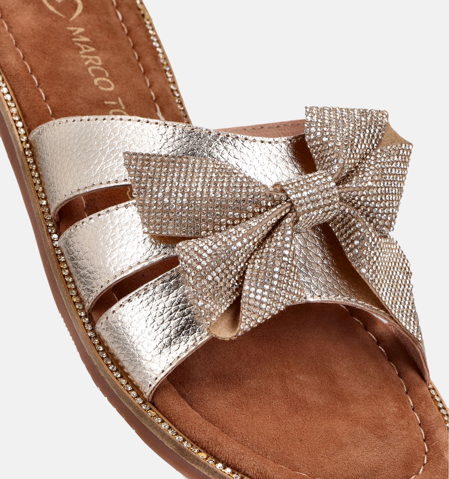 Ces mules plates de Marco Tozzi sont fabriquées en cuir de qualité et doublées en cuir. Ces matériaux ultra légers sont doux et agréables au contact de la peau. Ce modèle en or convient aux largeurs de pied F - Semelle normale. Vous savez que la largeur et la pointure vous conviennent si vos talons et vos orteils restent bien dans le lit plantaire de ces nu-pieds Marco Tozzi. La bride de ces nu-pieds en or doit tenir fermement votre pied, sans jamais être trop serrée.