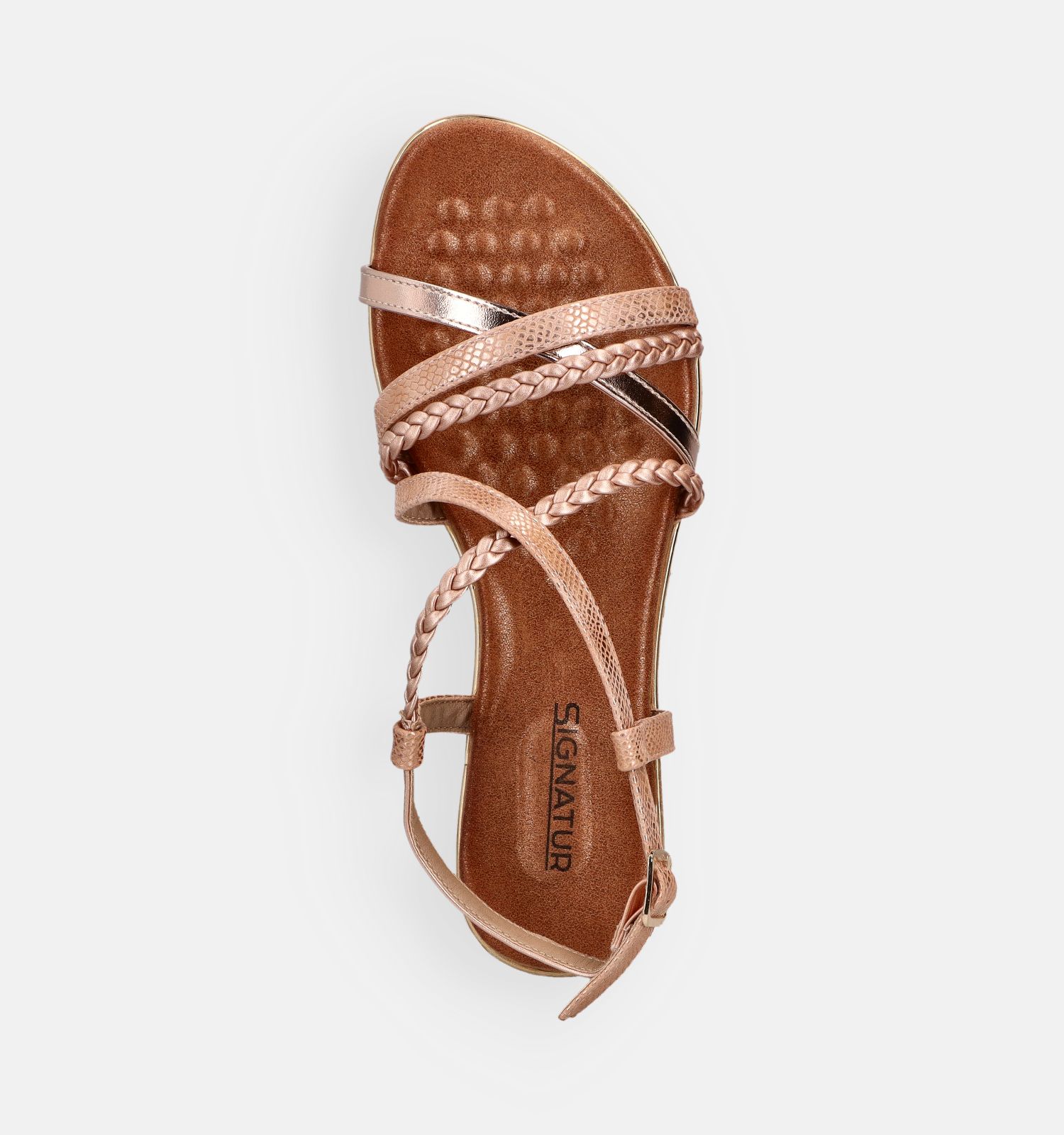 Ces sandales plates en or rose sont fabriquées en simili cuir de haute qualité. Leur matière légère aide à prévenir la fatigue des pieds — profitez pleinement de chaque instant avec Signatur !