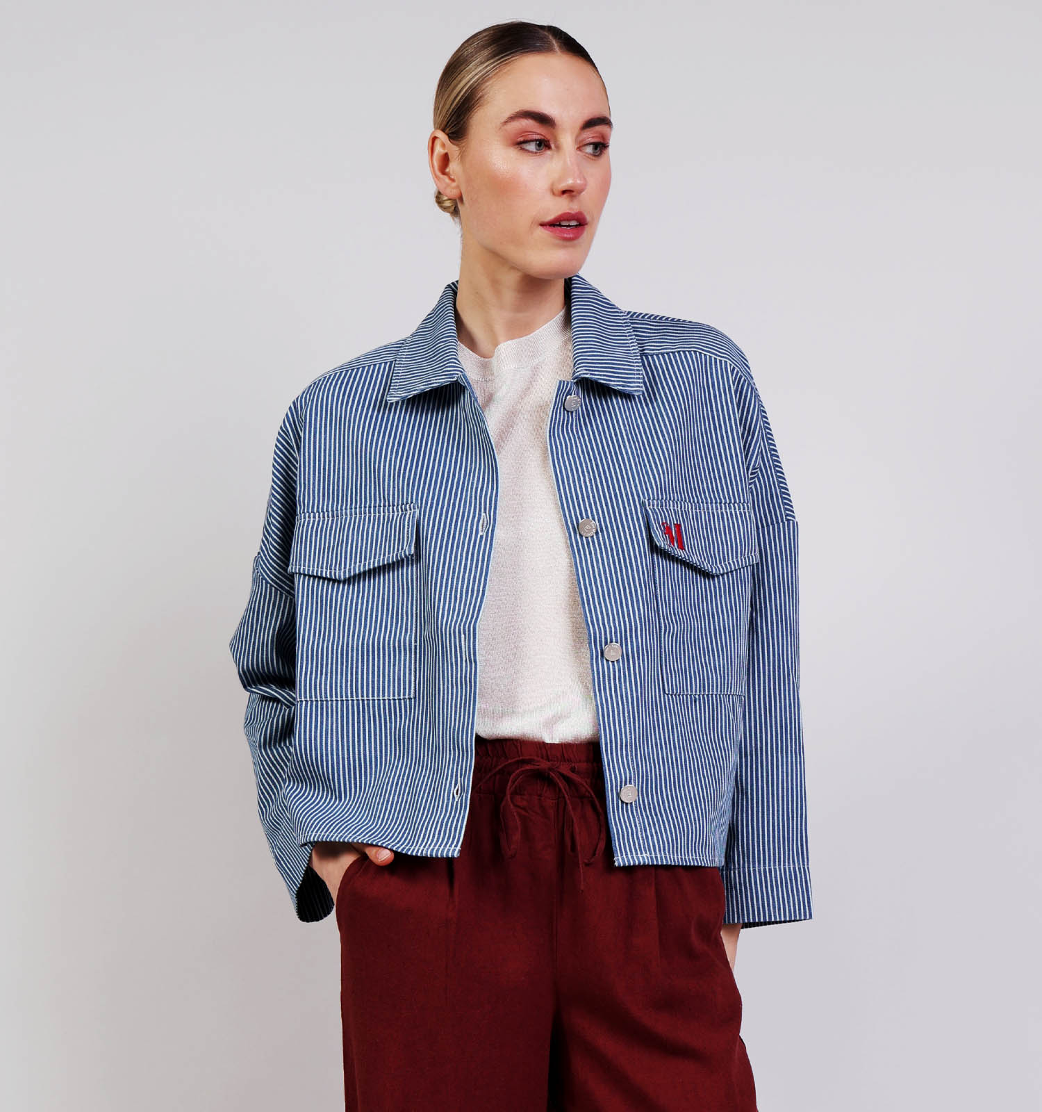 Cette veste en bleu pour femme a une coupe droit. Cette veste Rue Mazarine a donc une très belle coupe, adaptée à toutes les morphologies. Si vous aimez porter de gros pulls confortables, nous vous recommandons de choisir une taille au-dessus pour un ajustement optimal.