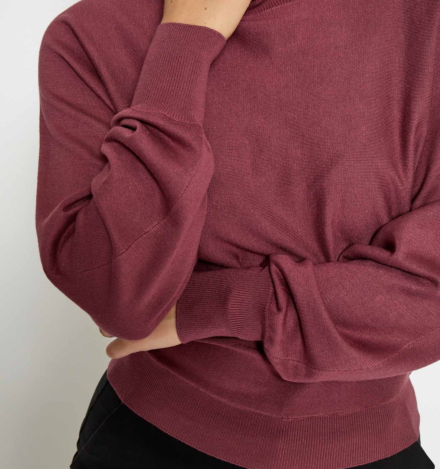 Ce pull pour femme en couleur bordeaux a un col rond et manches longues.