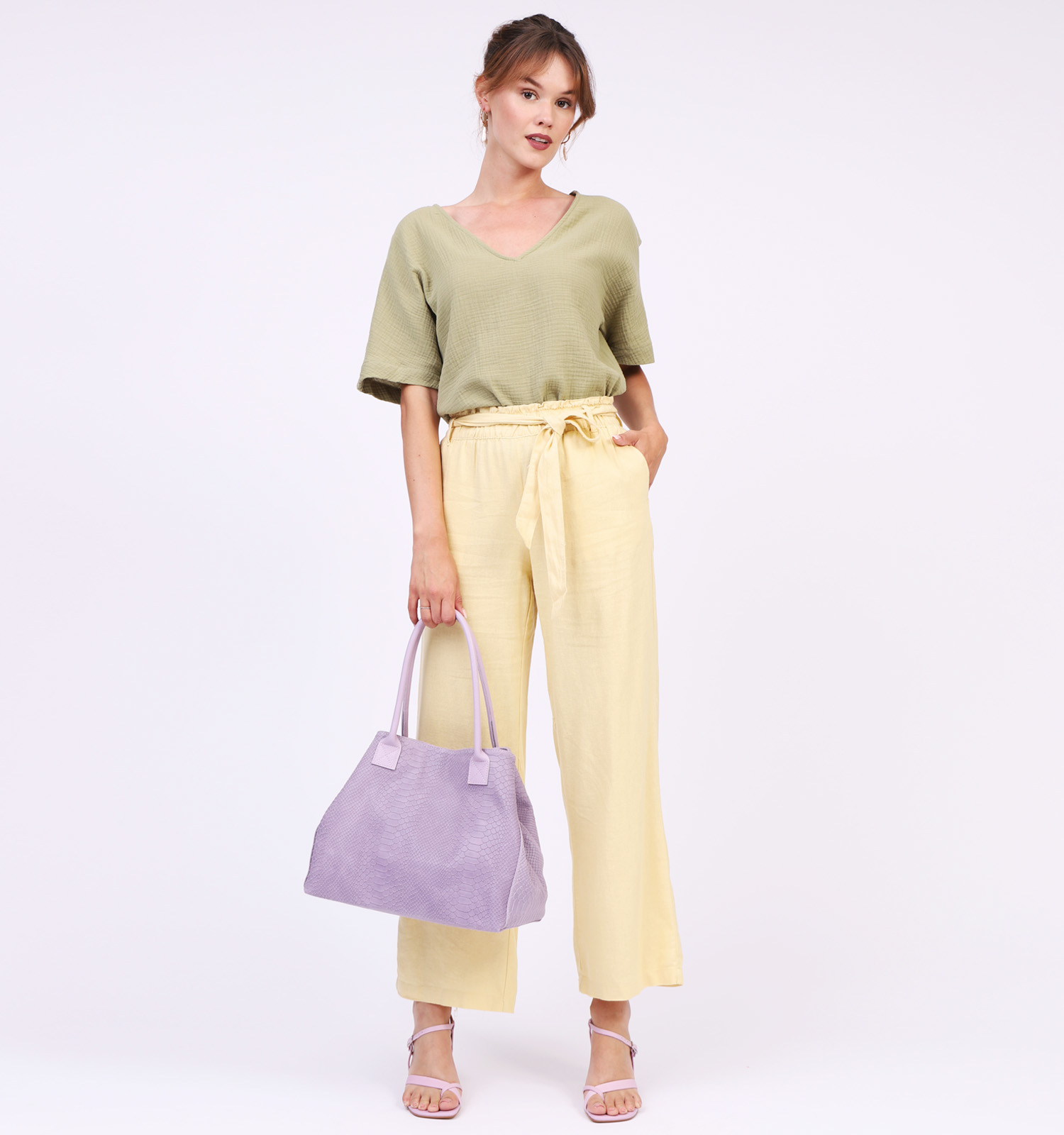 Les jambes larges de ce pantalon de JDY feront paraître les vôtres plus longues. Accentuez votre taille et adoptez une belle silhouette en sablier, en rentrant votre haut (pull, t-shirt, blouse, chemise ou débardeur) dans votre pantalon ! Complétez votre look avec un joli sac à main en jaune.