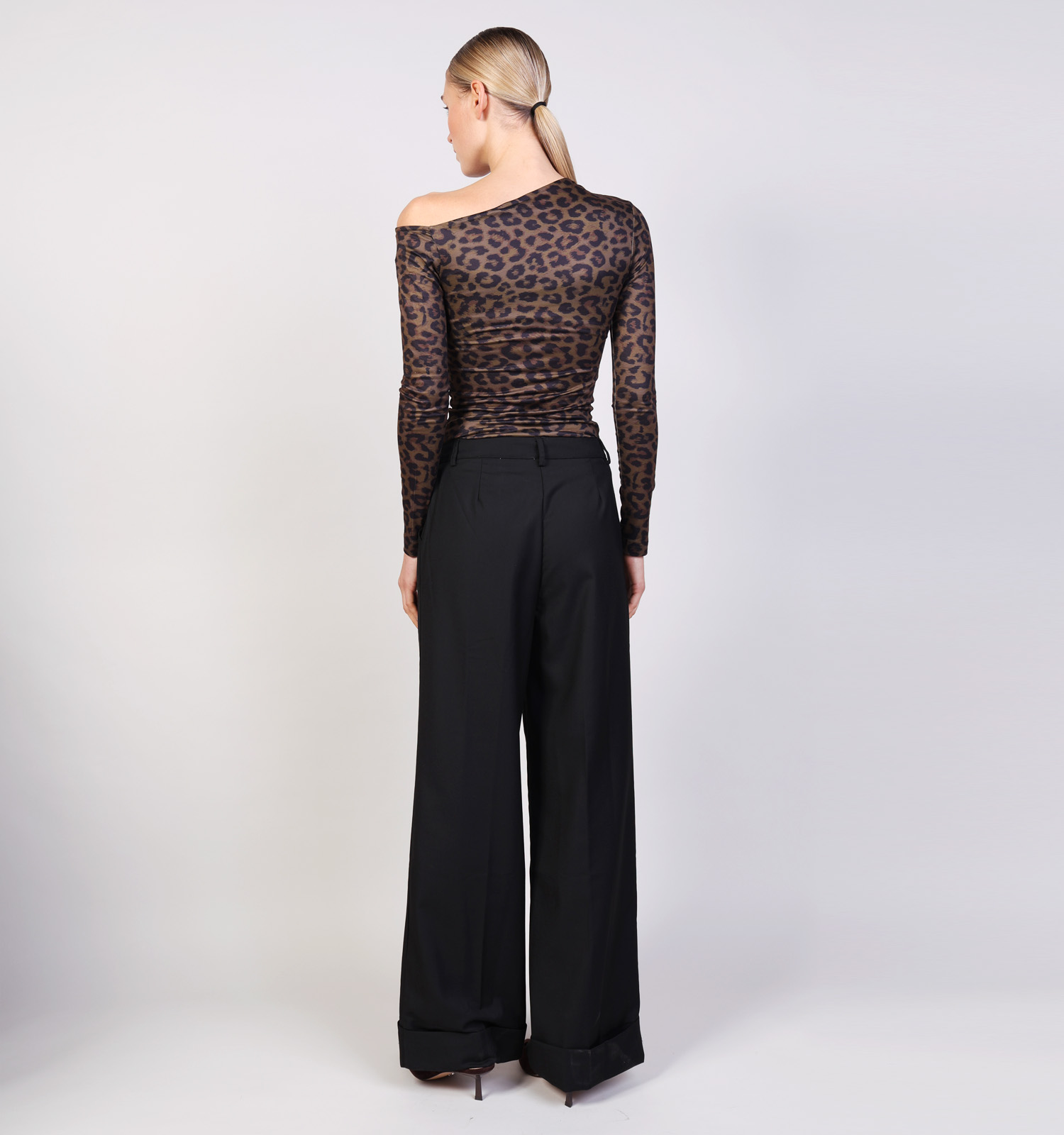 Ce pantalon habillé pour femmes a une taille taille haute et une coupe fluide.