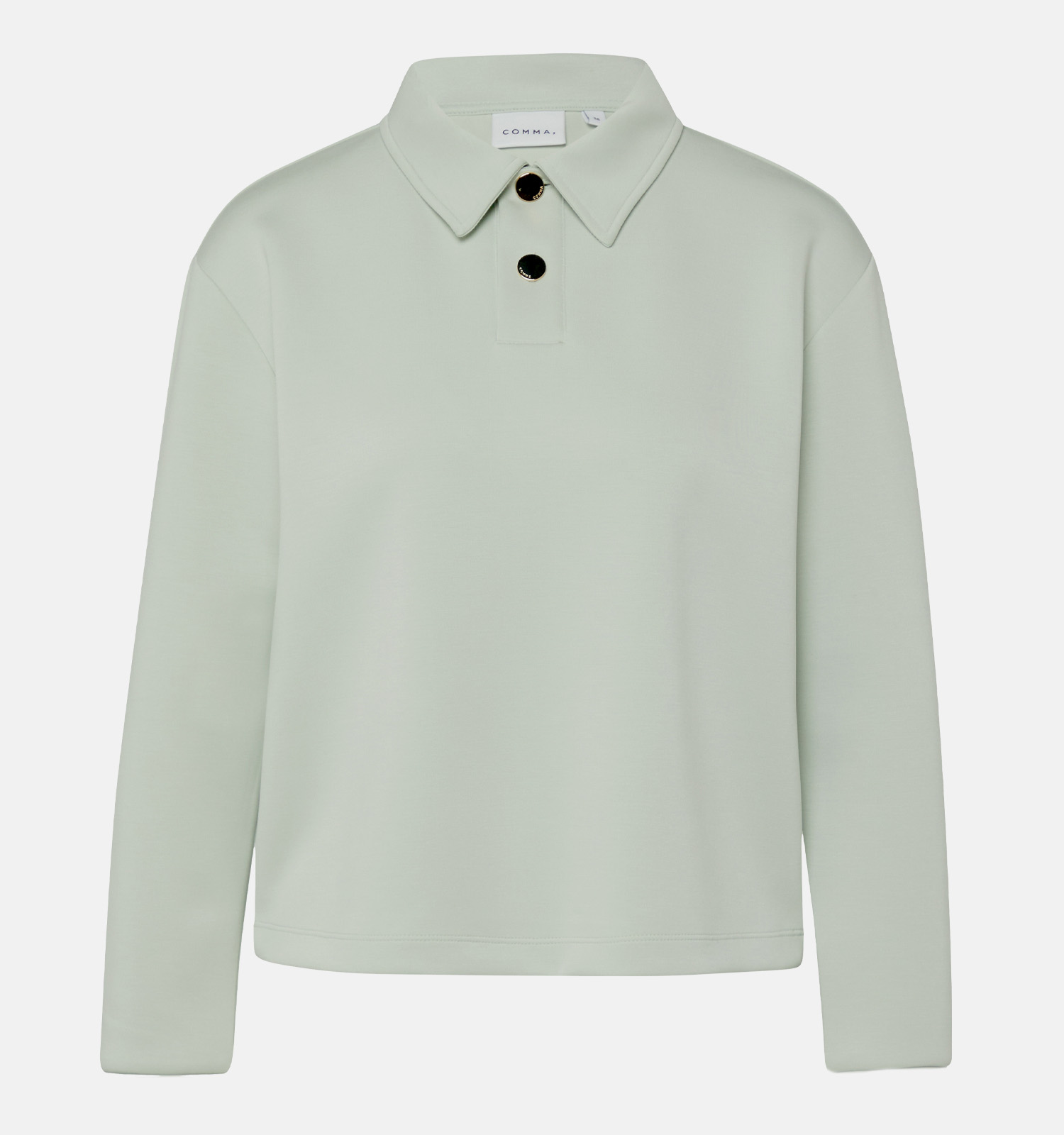 Ce pull pour femme en couleur beige a un col chemise ou polo et manches longues.