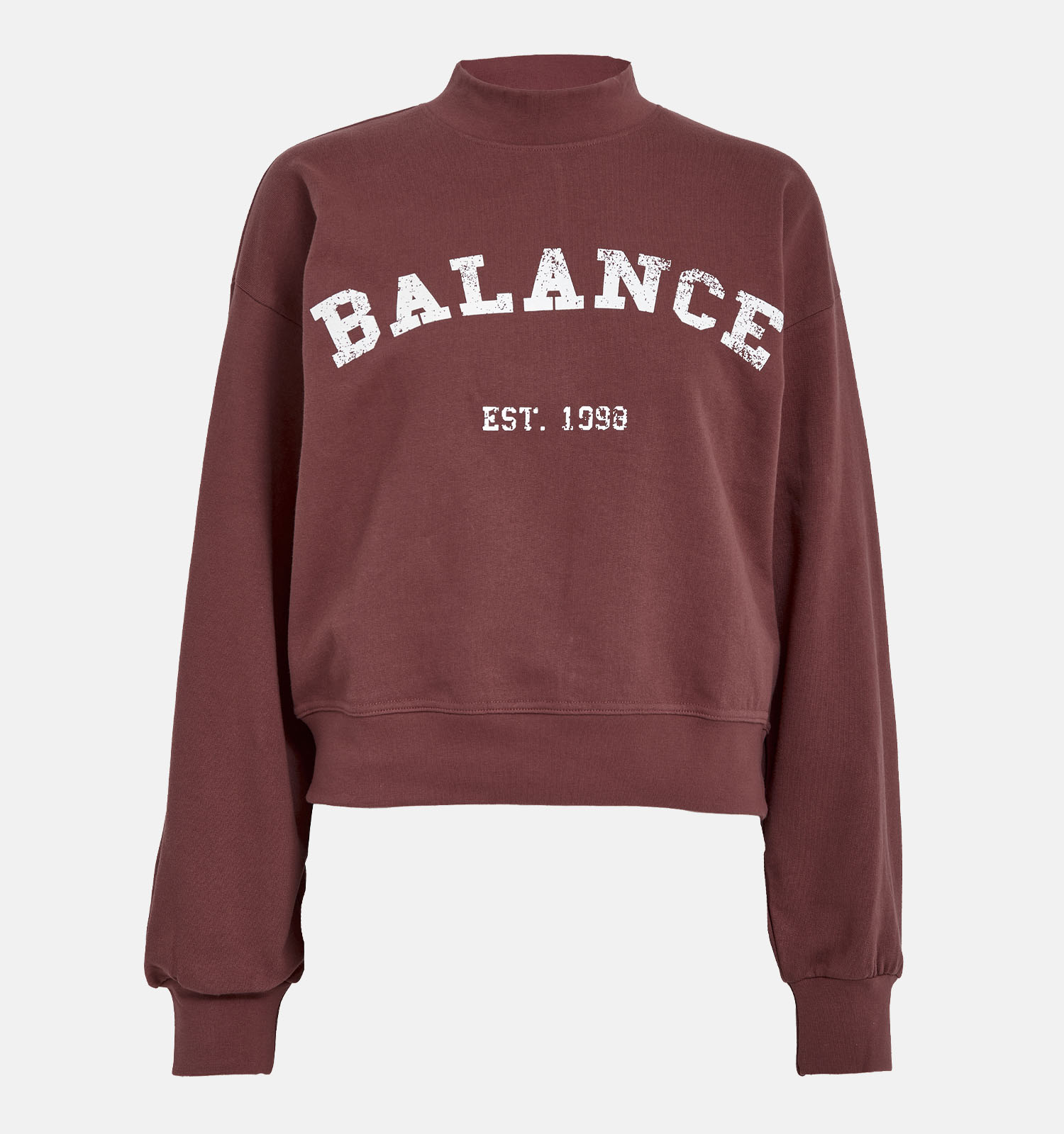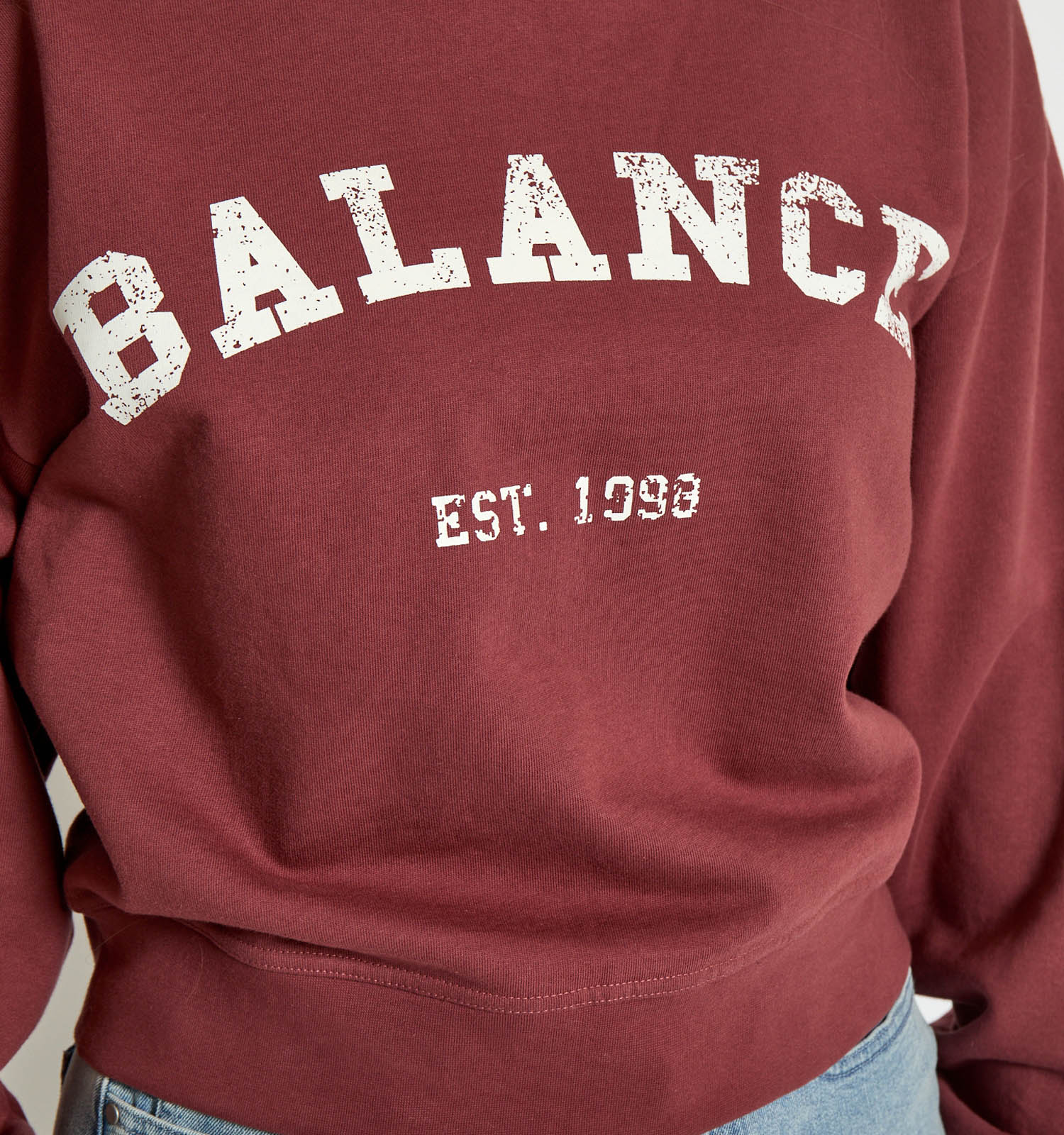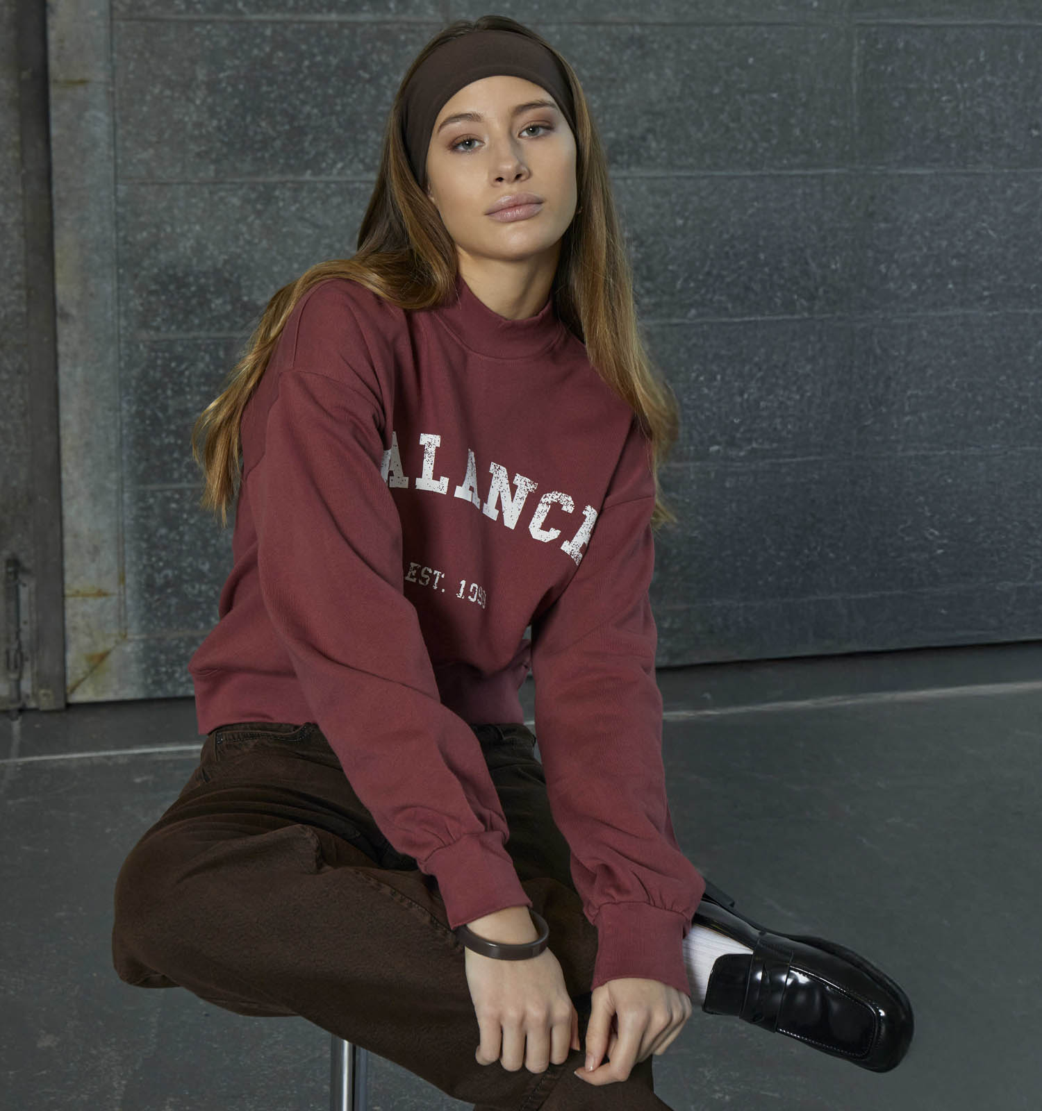 Ce pull Minus en couleur bordeaux a un col rond et manches longues.