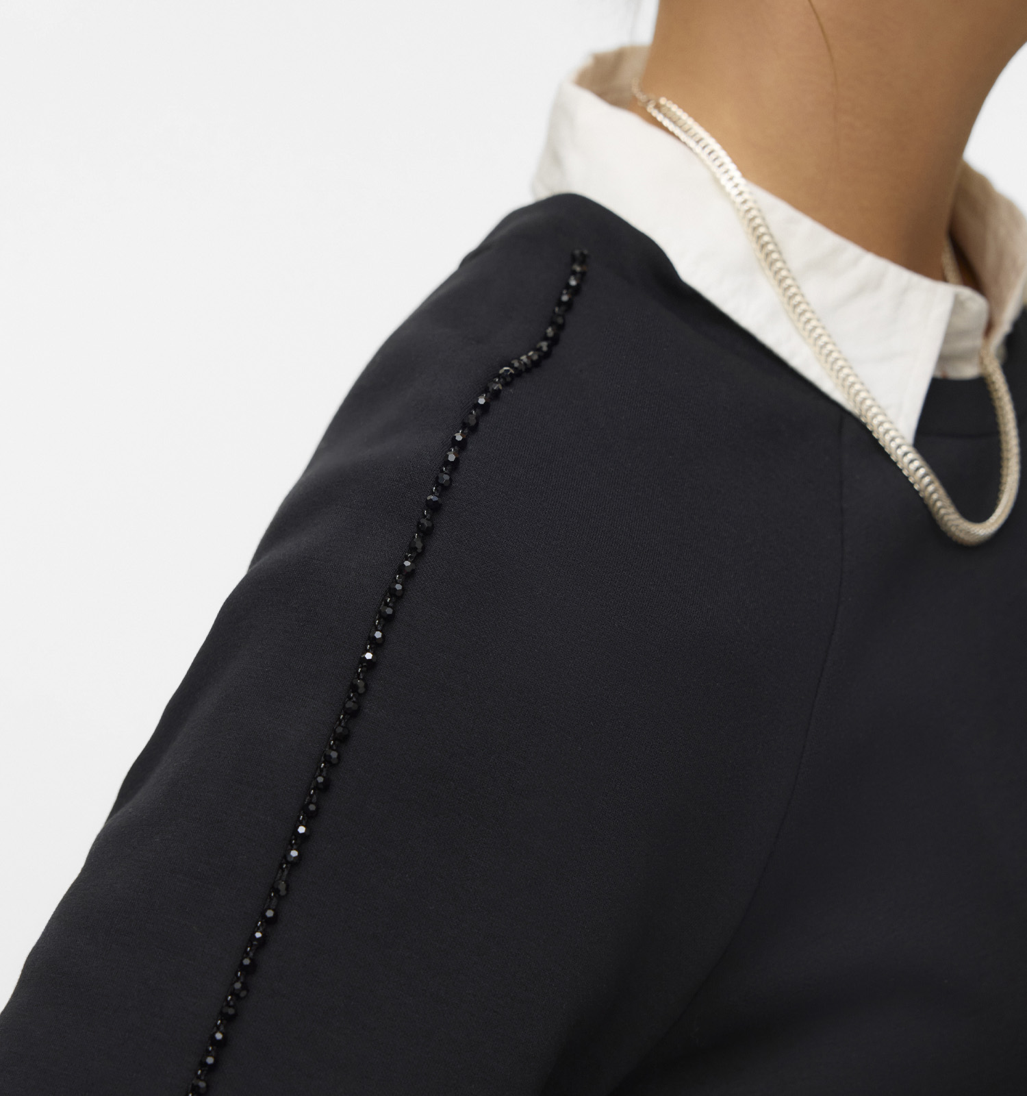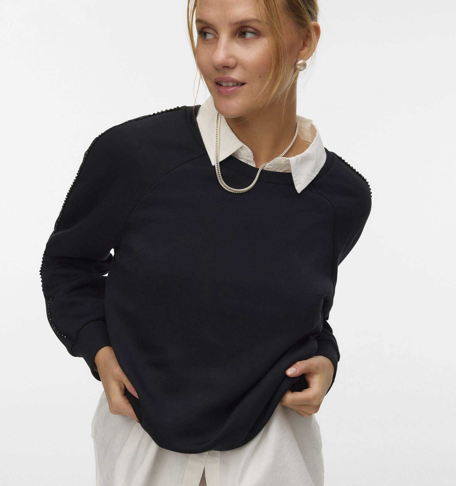 Une autre combinaison tendance est ce pull porté par-dessus une robe. Enfile ta robe préférée et ajoute ensuite une ceinture fine à la hauteur où tu veux que ce pull Vero Moda se termine. C'est une question de goût : ça peut être à ta taille, juste au-dessus des hanches ou quelque part entre les deux. La partie inférieure du pull Vero Moda, tu la glisses derrière la ceinture, et la partie supérieure, tu la fais légèrement blouser. Le résultat ? Tu as l'air encore plus stylée !