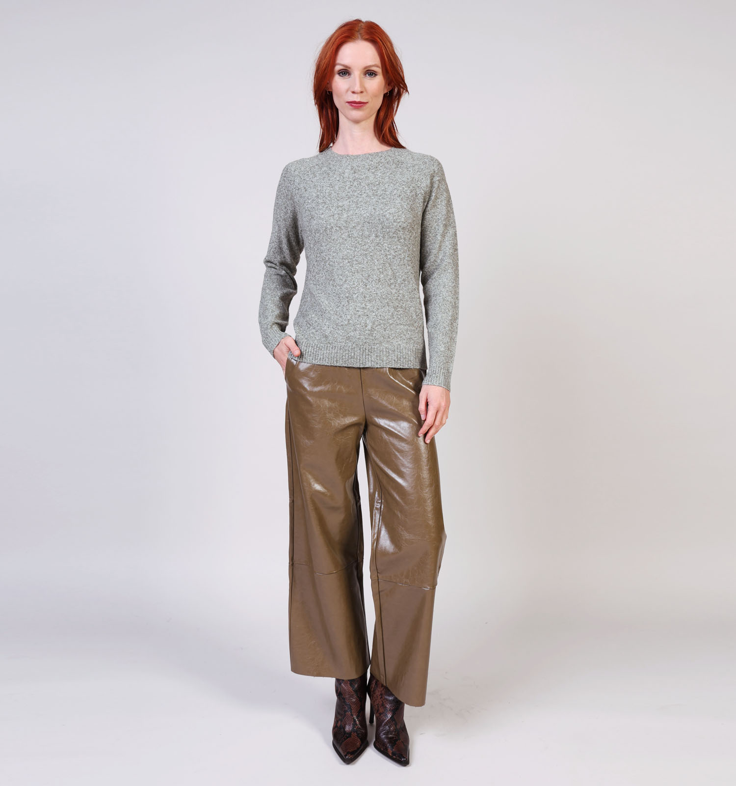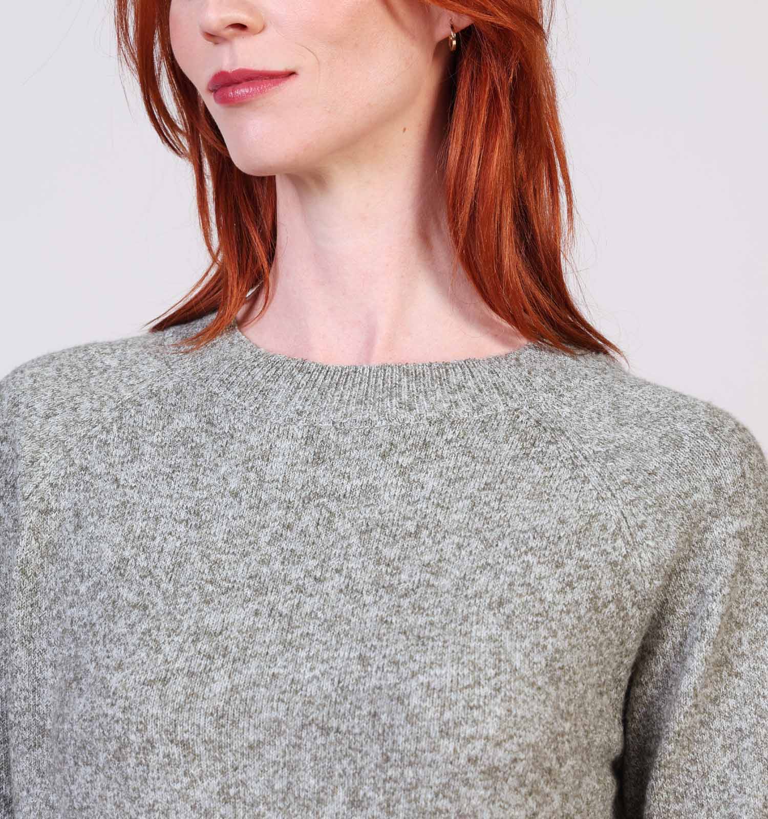 Ce pull pour femme en couleur vert a un col rond et manches longues.