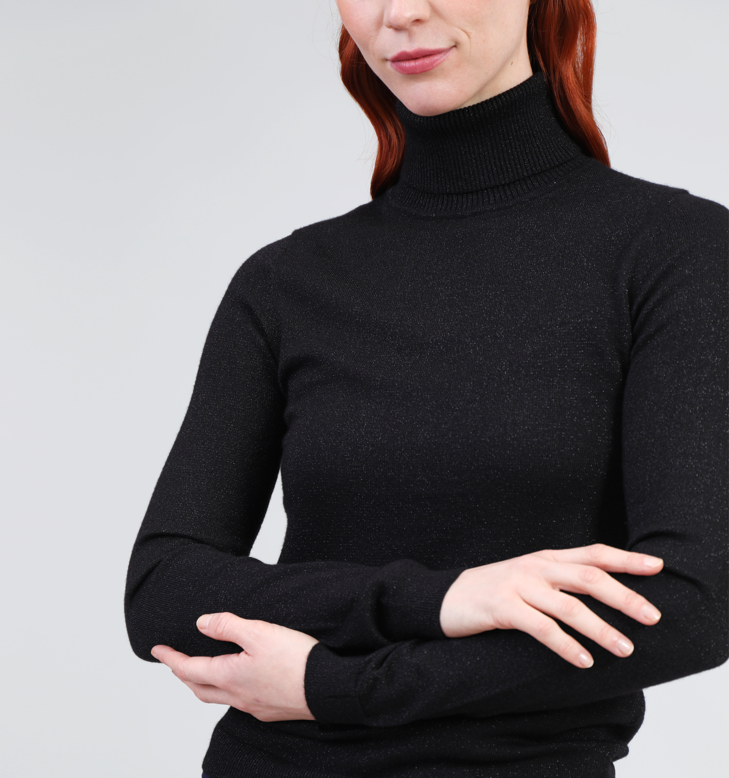 Ce pull pour femme en couleur noir a un col haut et manches longues.