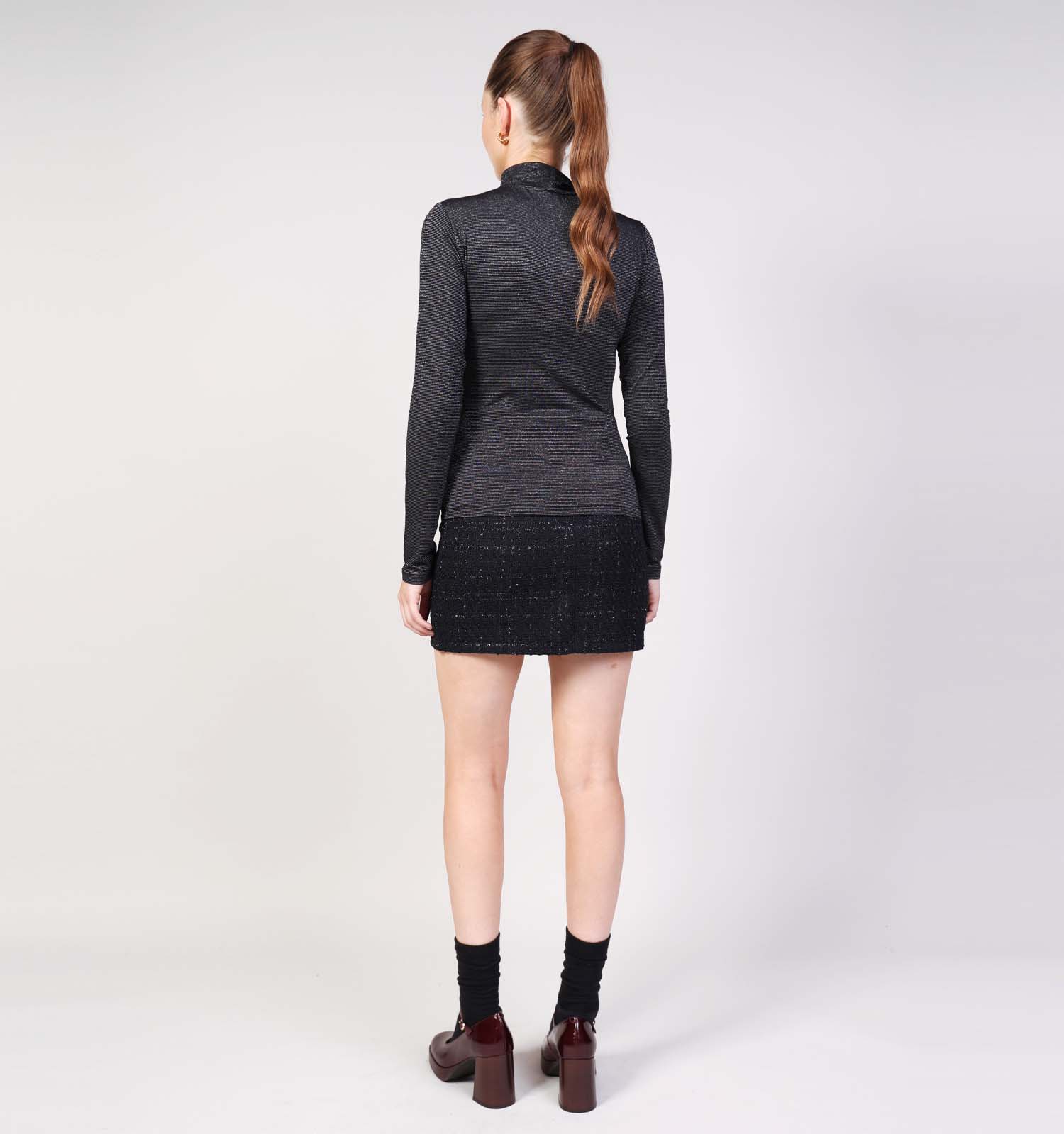 Ce pull pour femme en couleur noir a un col haut et manches longues.