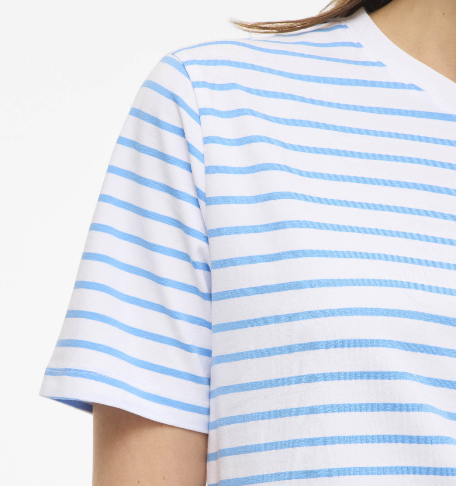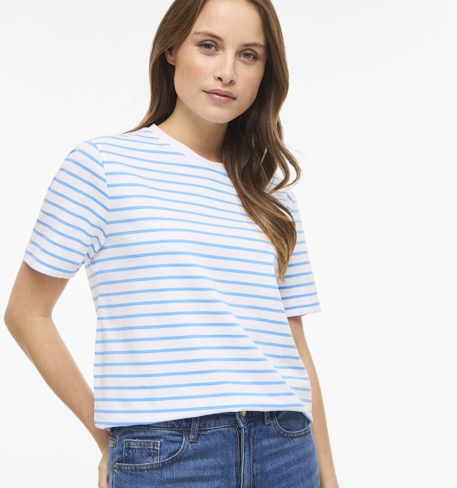 Ce T-shirt a manches courtes, ce qui vous permet de profiter de ce beau modèle toute l'année ! Autre point important : ce modèle Vila a une coupe droit. Il convient donc à toutes les morphologies. Ce T-shirt en bleu pour femmes a un joli col col rond que vous pouvez éventuellement mettre en valeur avec vos colliers préférés.