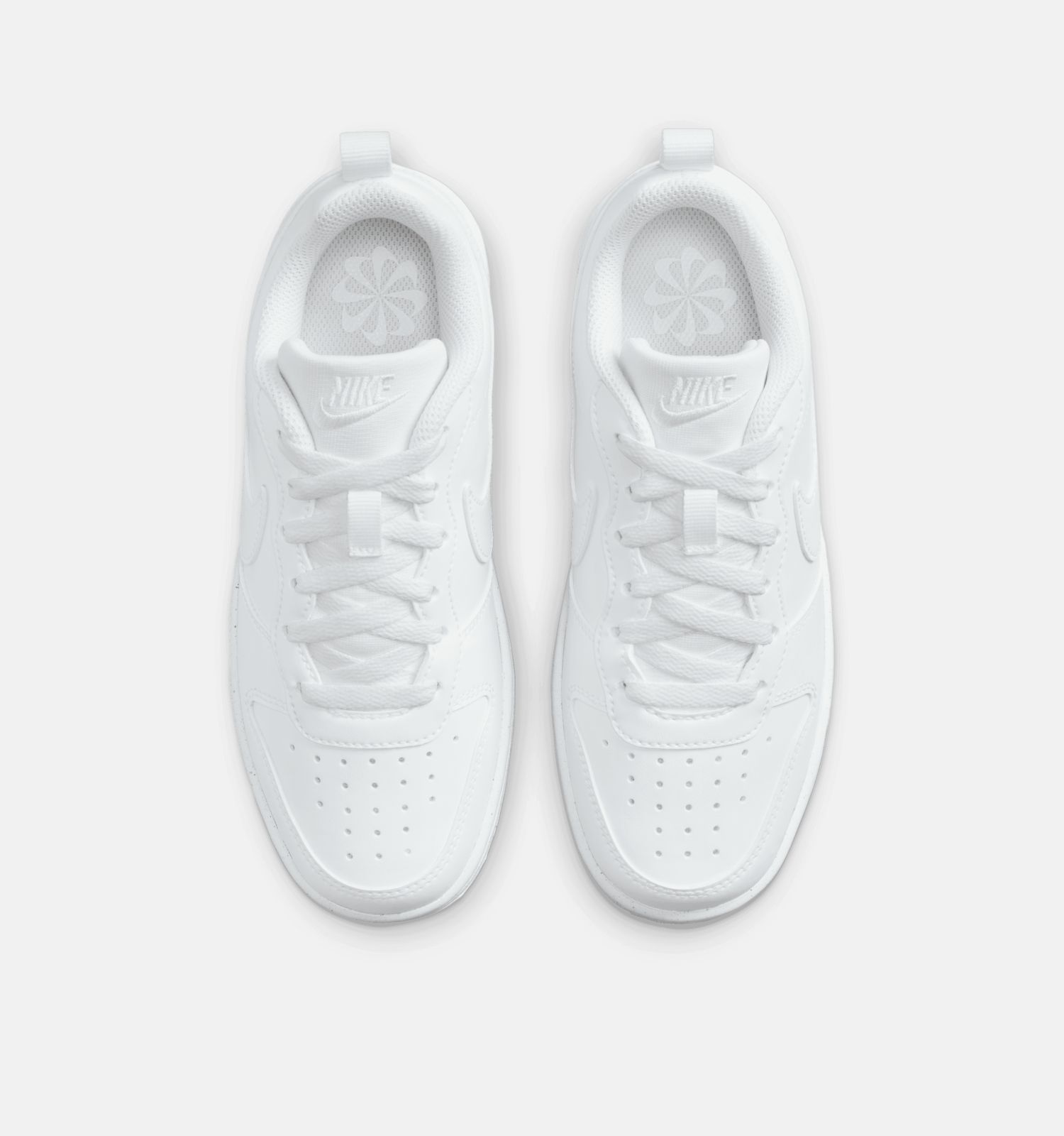 Ces baskets en blanc Nike Court Borough ont un intérieur respirant en textile, avec un solide simili cuir à l'extérieur. Il est important que ces Nikes soient bien ajustées : choisissez donc une pointure dans laquelle les orteils ont encore assez de place pour bouger. La meilleure façon de le vérifier est de toucher le bout de la chaussure lorsque l'enfant porte ces baskets Nike Court Borough en blanc.