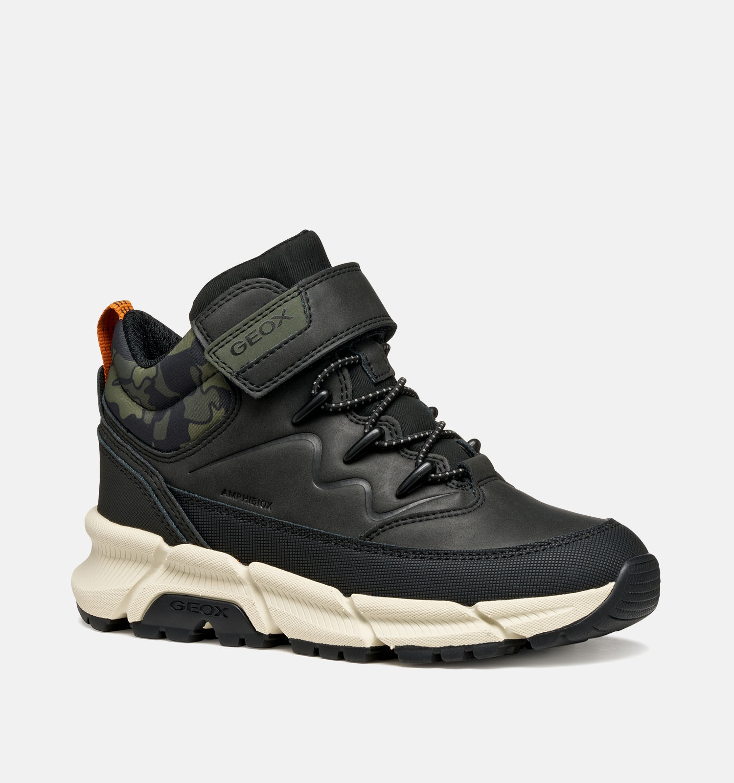 Bon à savoir : ces chaussures hautes en noir de Geox conviennent à garçons avec un cou-de-pied plus haut ! Ces chaussures Geox pour enfants de couleur noir ont un intérieur respirant de textile, avec un extérieur robuste de simili cuir.