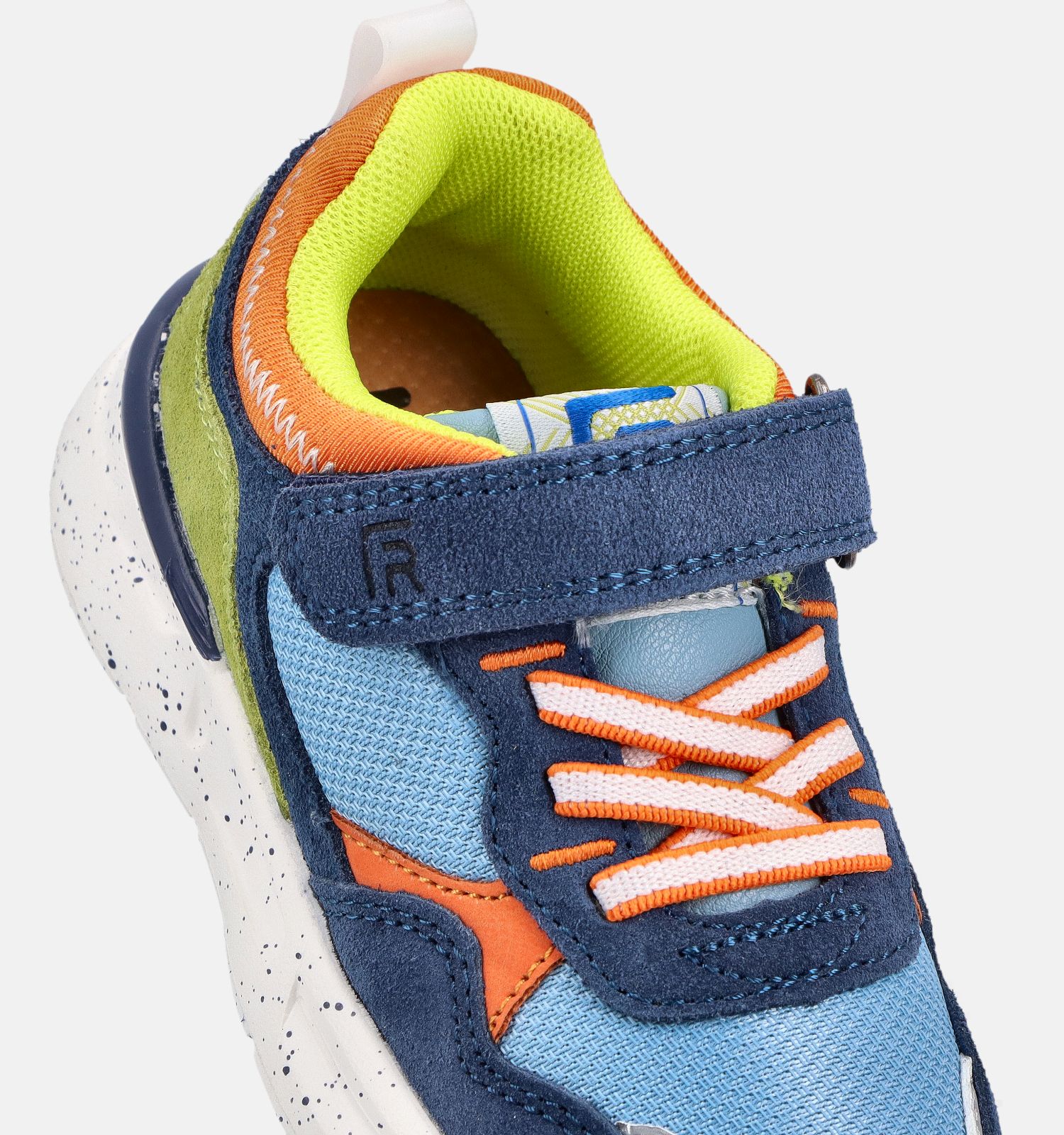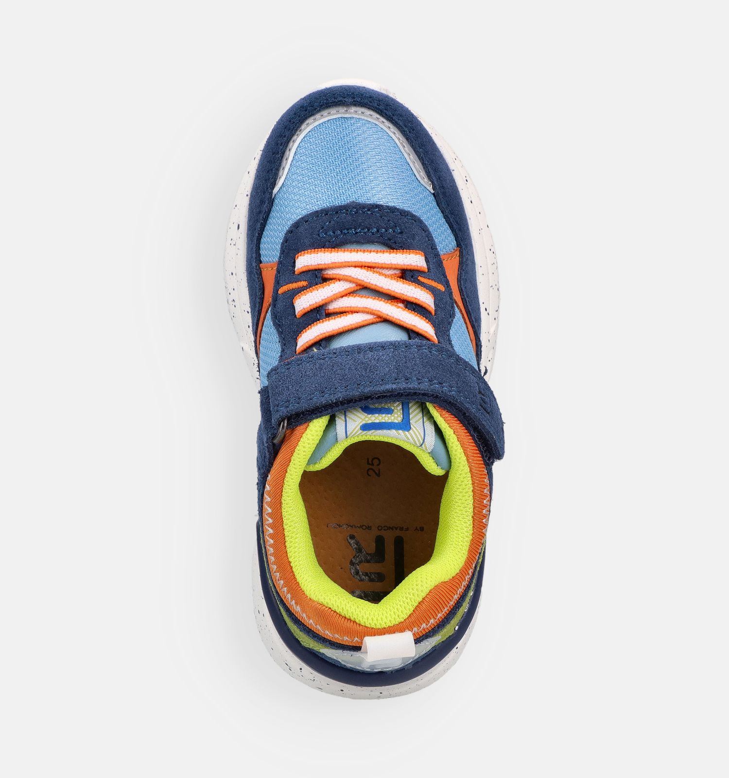 Ces baskets FR by Romagnoli ont une fermeture ferme élastique & velcro. Ces baskets en bleu pour garçons restent bien en place pendant qu'ils marchent, courent, sautent et font du sport ! Les semelles semi-souples et résistantes à l'abrasion permettent également aux pieds de rouler facilement pendant la marche. C'est important pour la stabilité et l'équilibre, mais cela permet aussi aux garçons de ne pas se fatiguer les pieds.