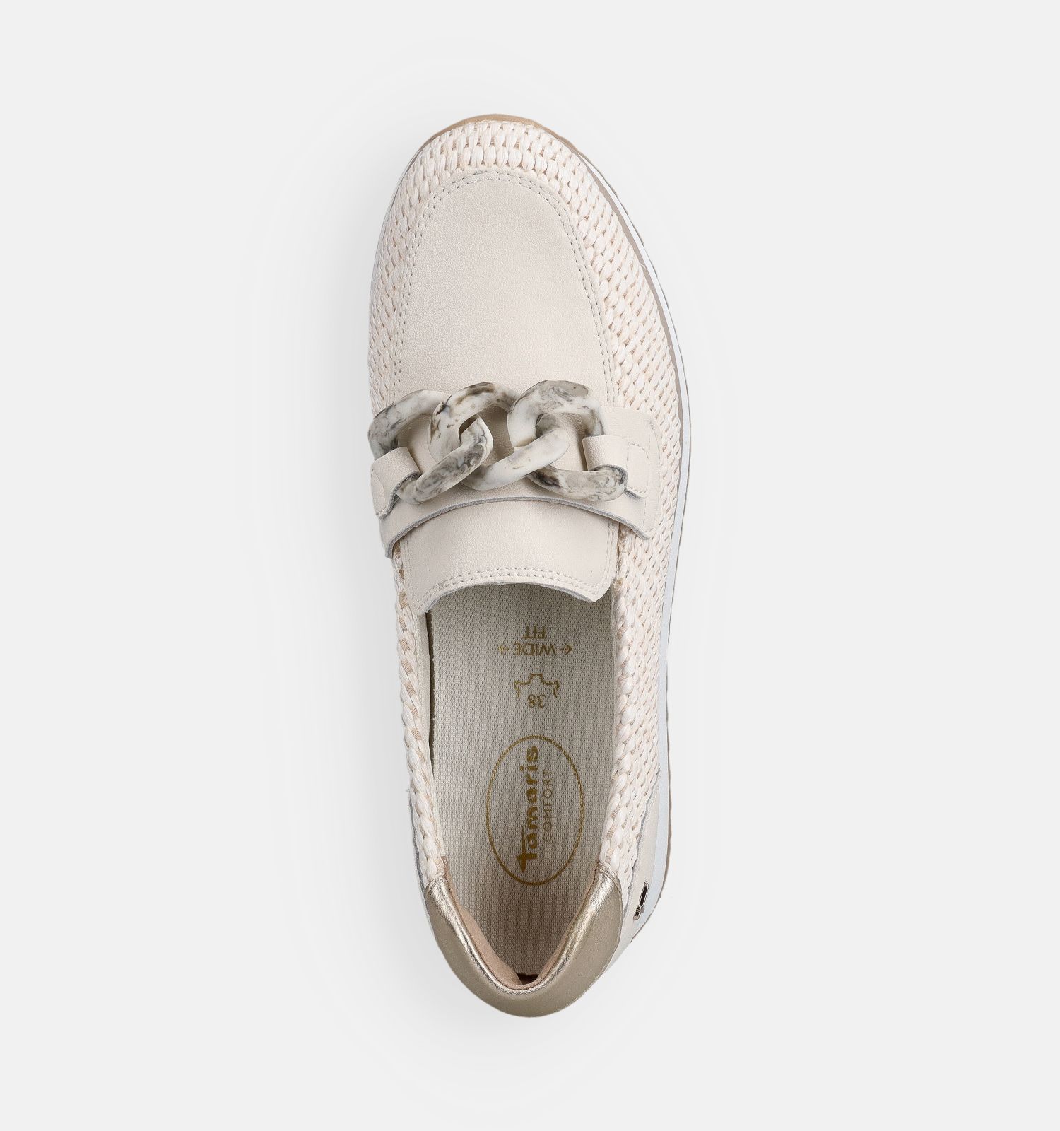Tamaris Comfort est la dernière collection de chaussures de Tamaris ! Ces chaussures plates en beige font partie de cette nouvelle collection. L'assise plantaire amovible est ergonomique et soulage la pression sur les talons et sur la plante du pied. Cela garantit un confort de marche quasi paradisiaque. La collection Tamaris Comfort se distingue par sa coupe. En réalité, ces chaussures plates sont juste un peu plus larges en termes de forme, donnant aux pieds plus d'espace pour respirer et juste assez pour soulager ces pieds légèrement gonflés à la fin de la journée. Ces chaussures plates en beige sont fabriqués à partir de cuir, raphia, simili cuir, avec une finition de daim, textile à l'intérieur.
