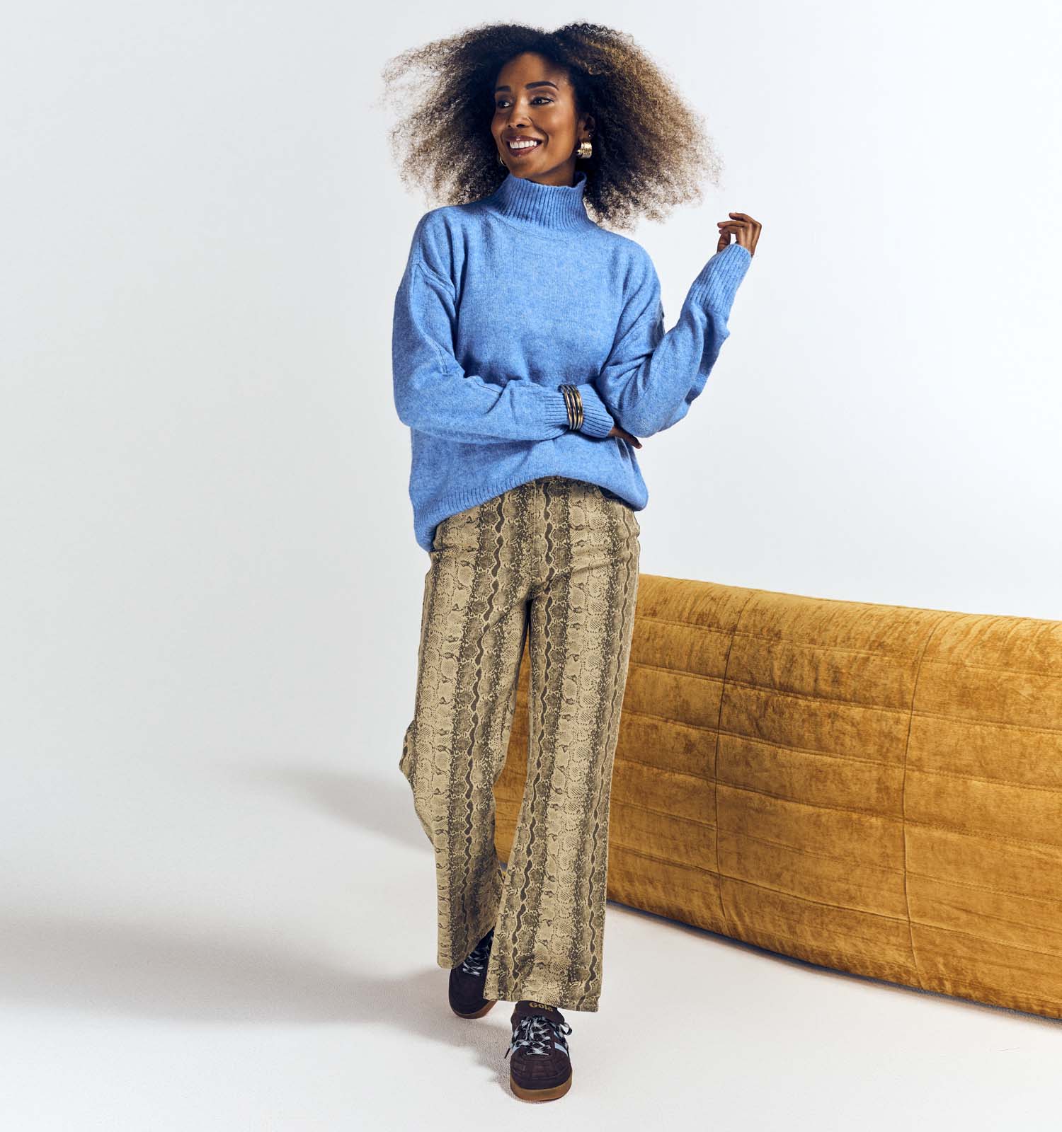 Une autre combinaison tendance est ce pull porté par-dessus une robe. Enfile ta robe préférée et ajoute ensuite une ceinture fine à la hauteur où tu veux que ce pull Desires se termine. C'est une question de goût : ça peut être à ta taille, juste au-dessus des hanches ou quelque part entre les deux. La partie inférieure du pull Desires, tu la glisses derrière la ceinture, et la partie supérieure, tu la fais légèrement blouser. Le résultat ? Tu as l'air encore plus stylée !