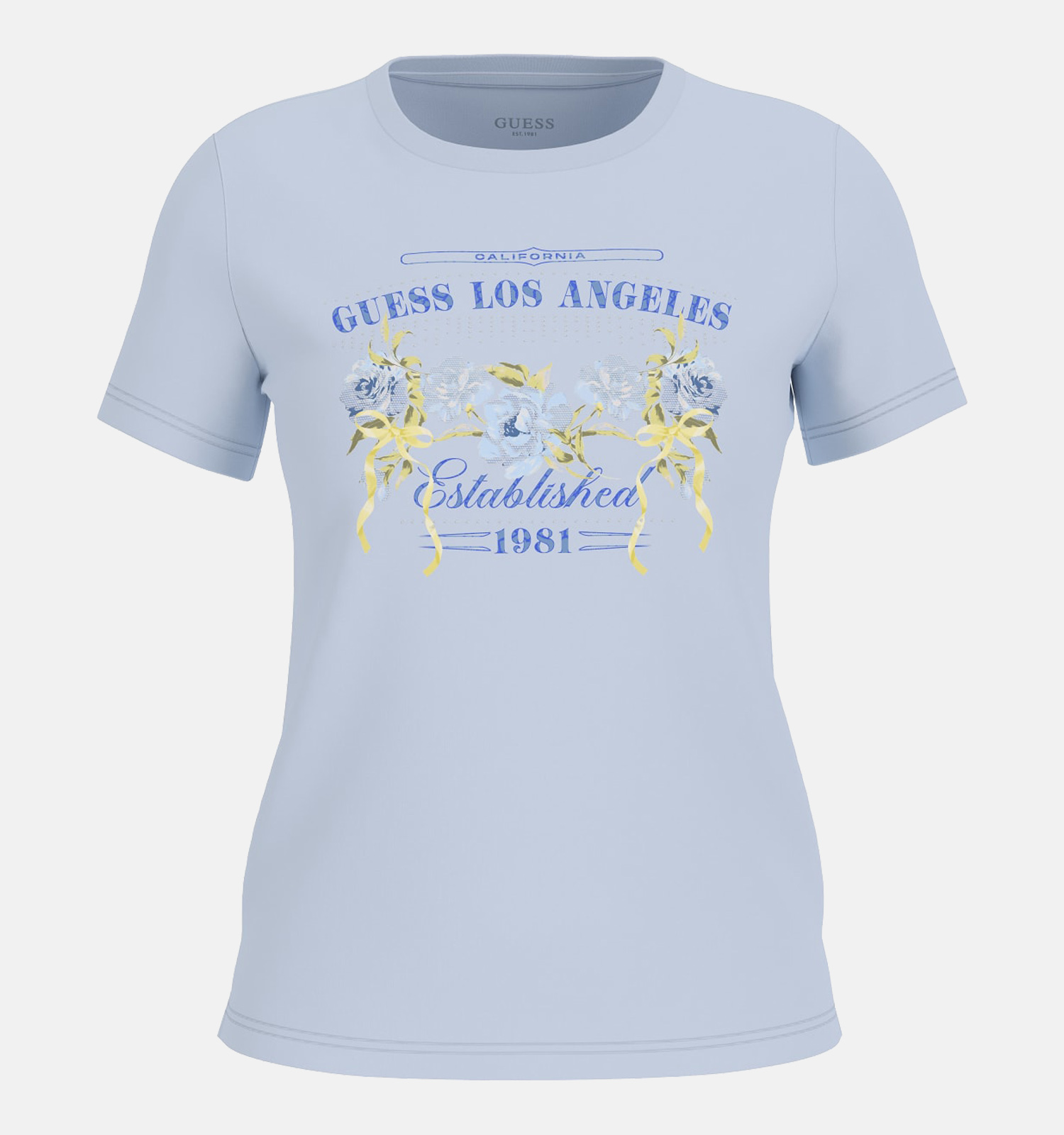 Ce T-shirt a manches courtes, ce qui vous permet de profiter de ce beau modèle toute l'année ! Autre point important : ce modèle Guess a une coupe droit. Il convient donc à toutes les morphologies. Ce T-shirt en bleu pour femmes a un joli col col rond que vous pouvez éventuellement mettre en valeur avec vos colliers préférés.