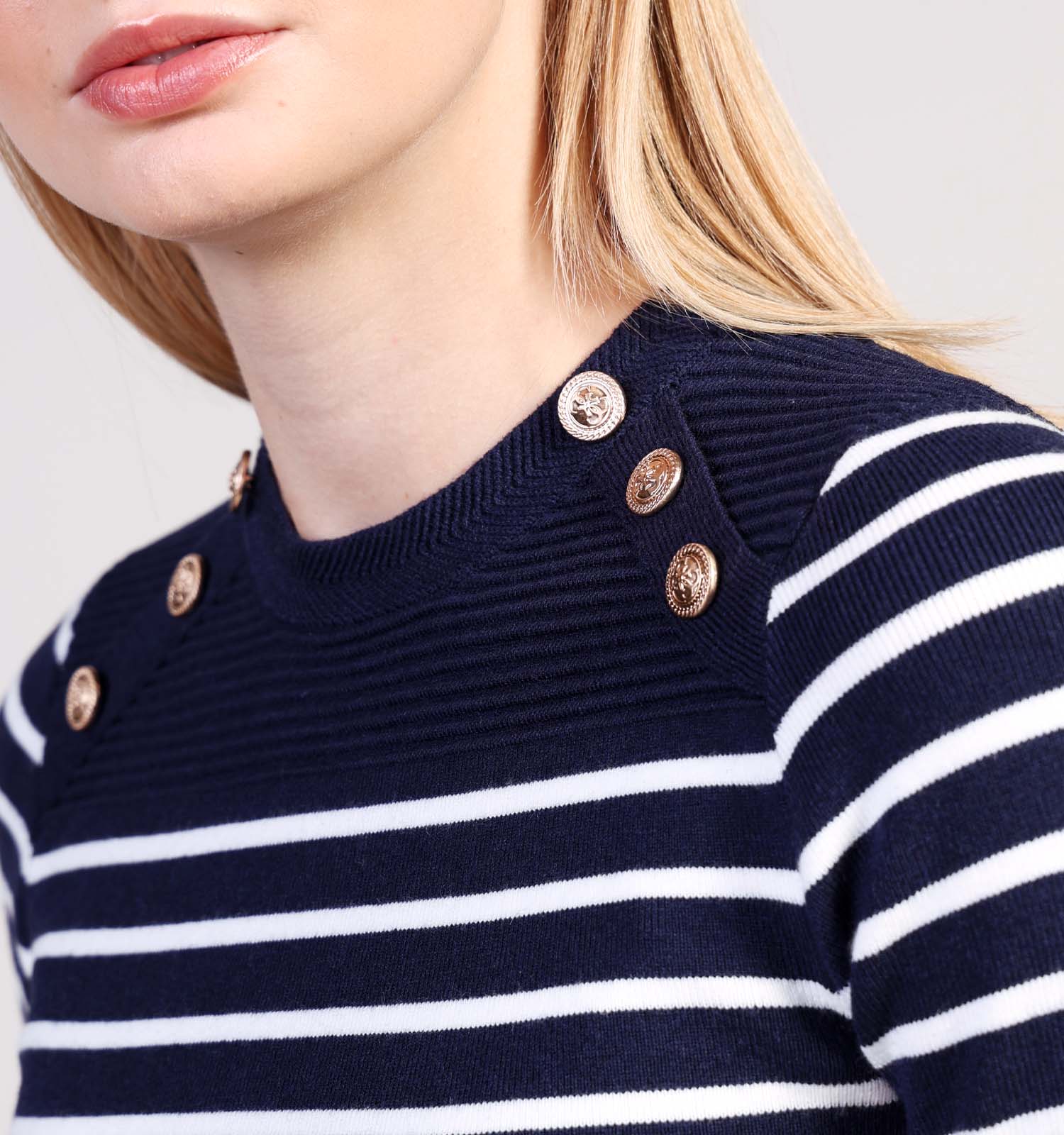 Ce pull Guess en couleur bleu a un col rond et manches longues.
