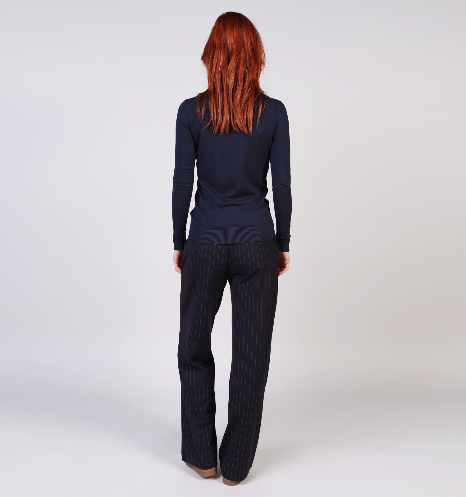 Ce pull pour femme en couleur bleu a un col haut et manches longues.