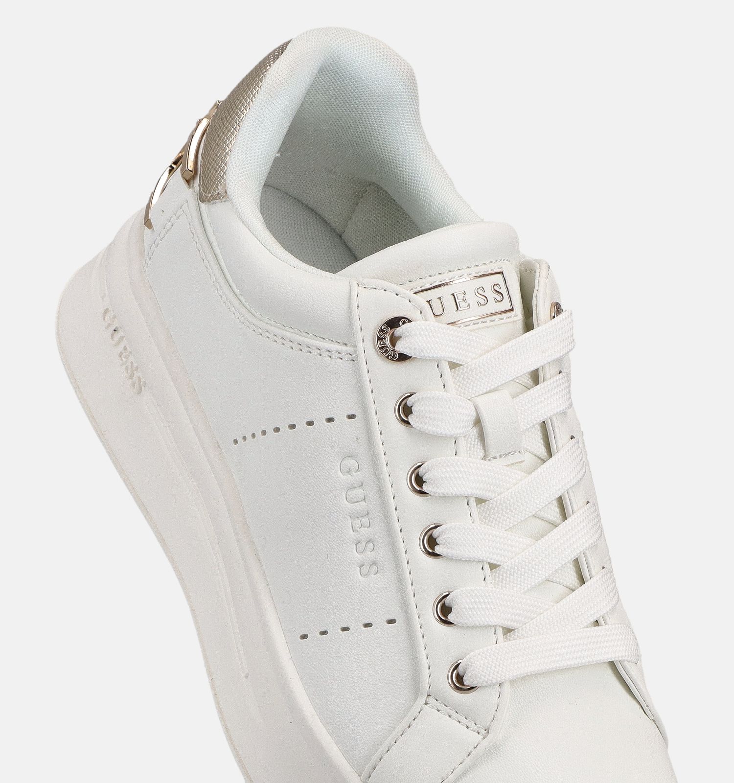 Ces baskets en blanc de Guess sont une version élégante des baskets classiques. Ces baskets habillées ont une silhouette plus fine avec des lignes féminines, fabriquées dans un matériau de haute qualité (BUITENMATERIAAL) avec une semelle intérieure respirante textile.