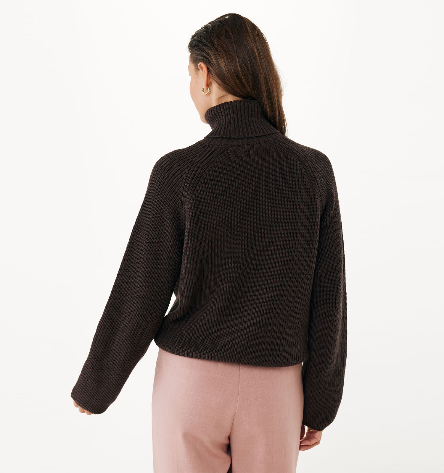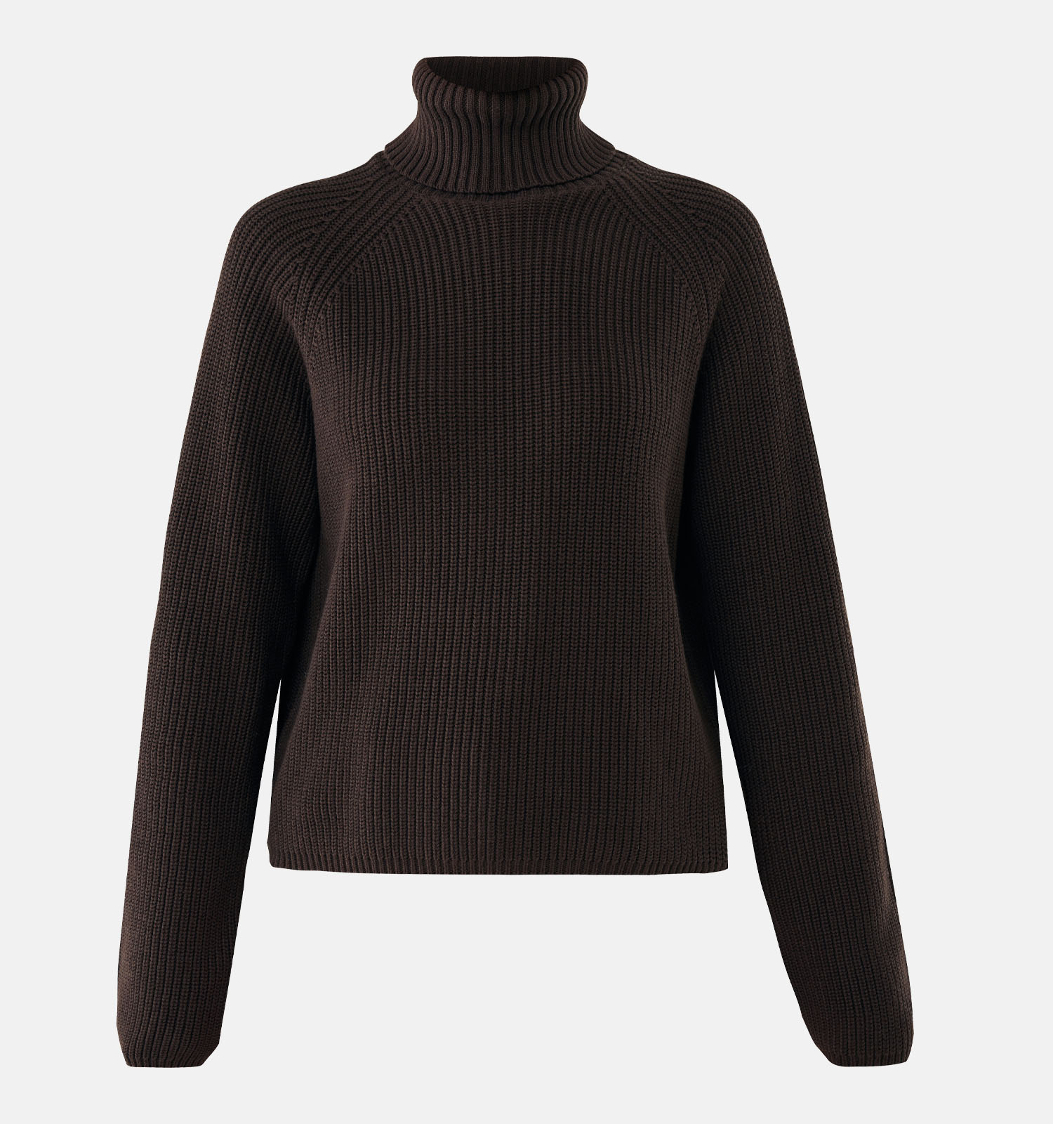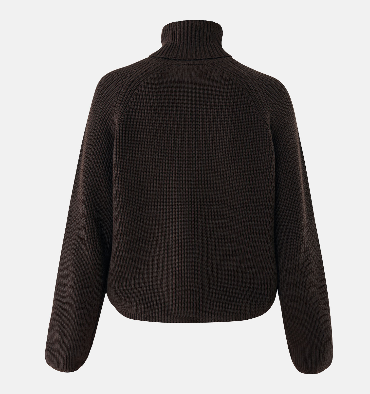 Ce pull pour femme en couleur marron a un col haut et manches longues.