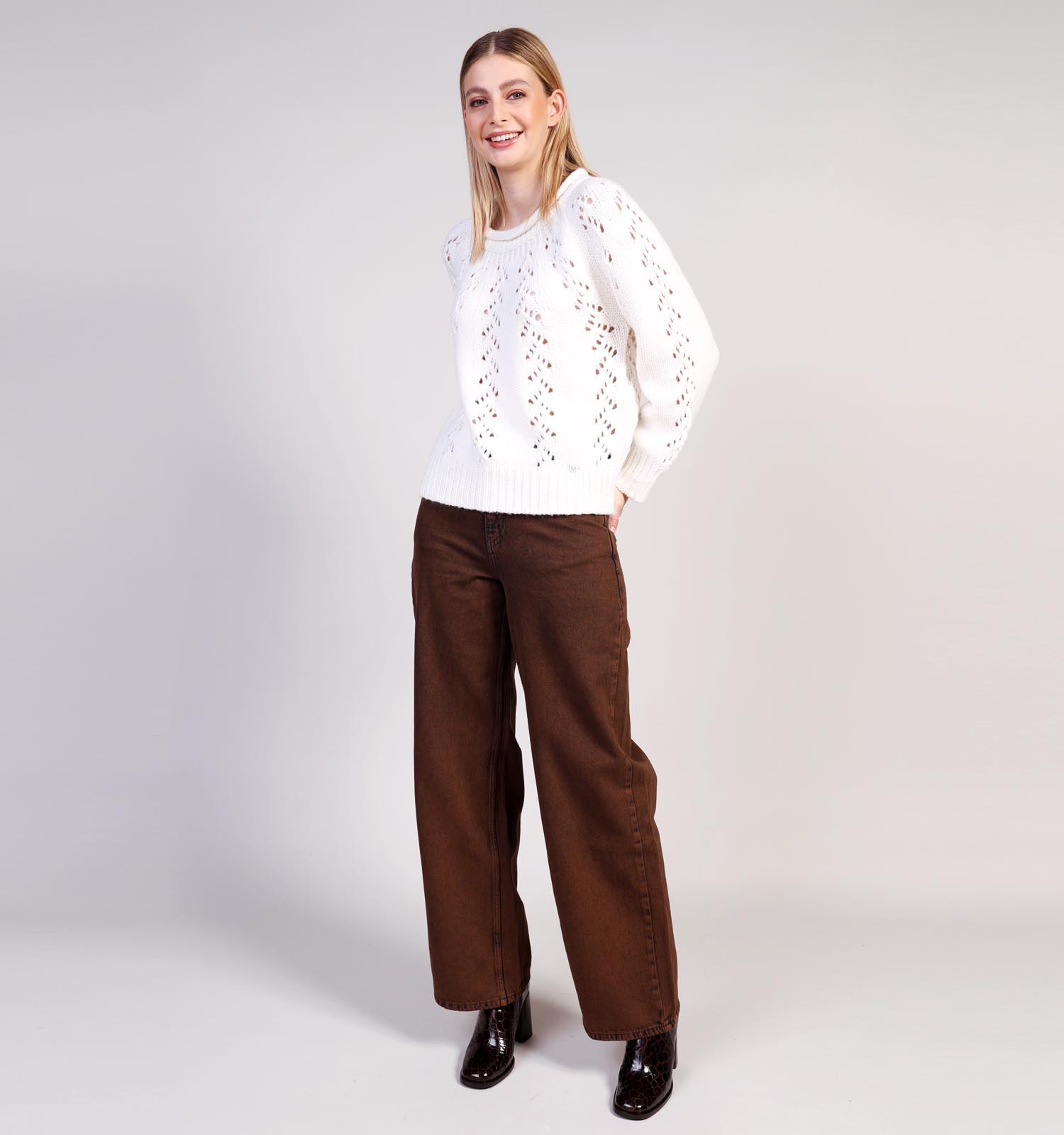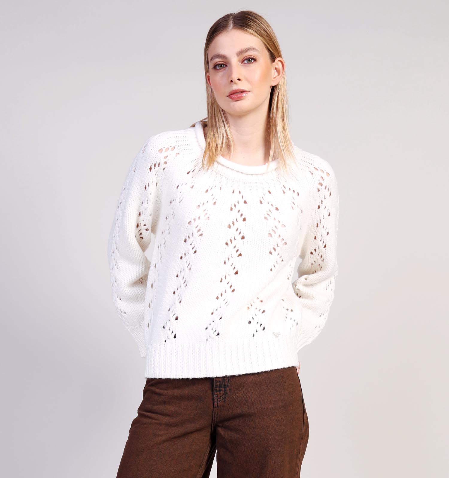 Ce pull pour femme en couleur beige a un col rond et manches longues.