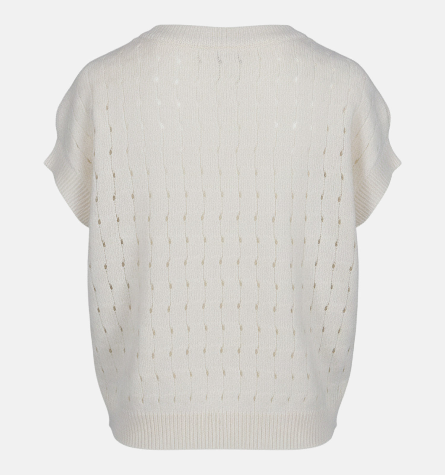 Ce pull pour femme en couleur beige a un col-en-v et manches courtes.