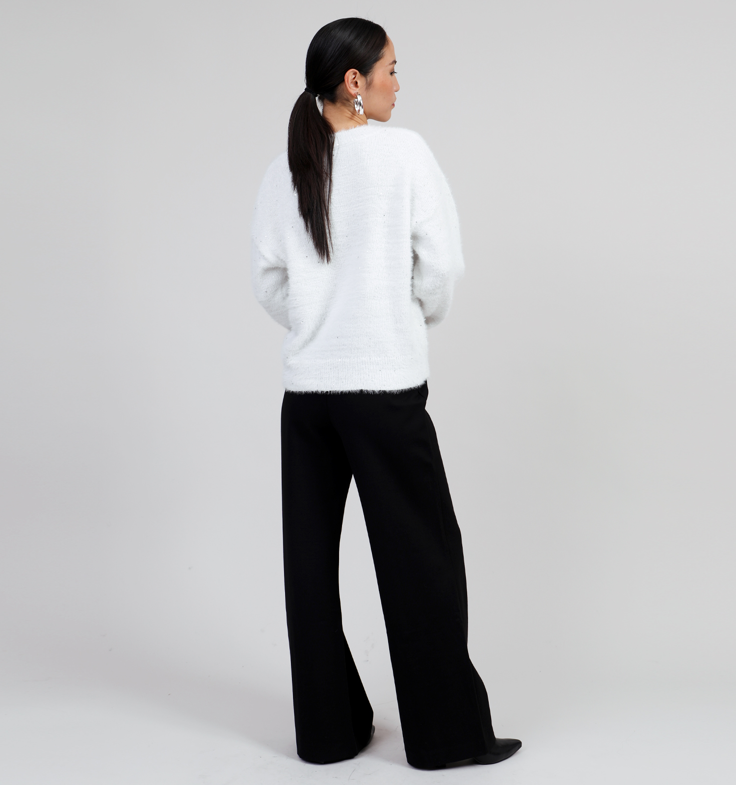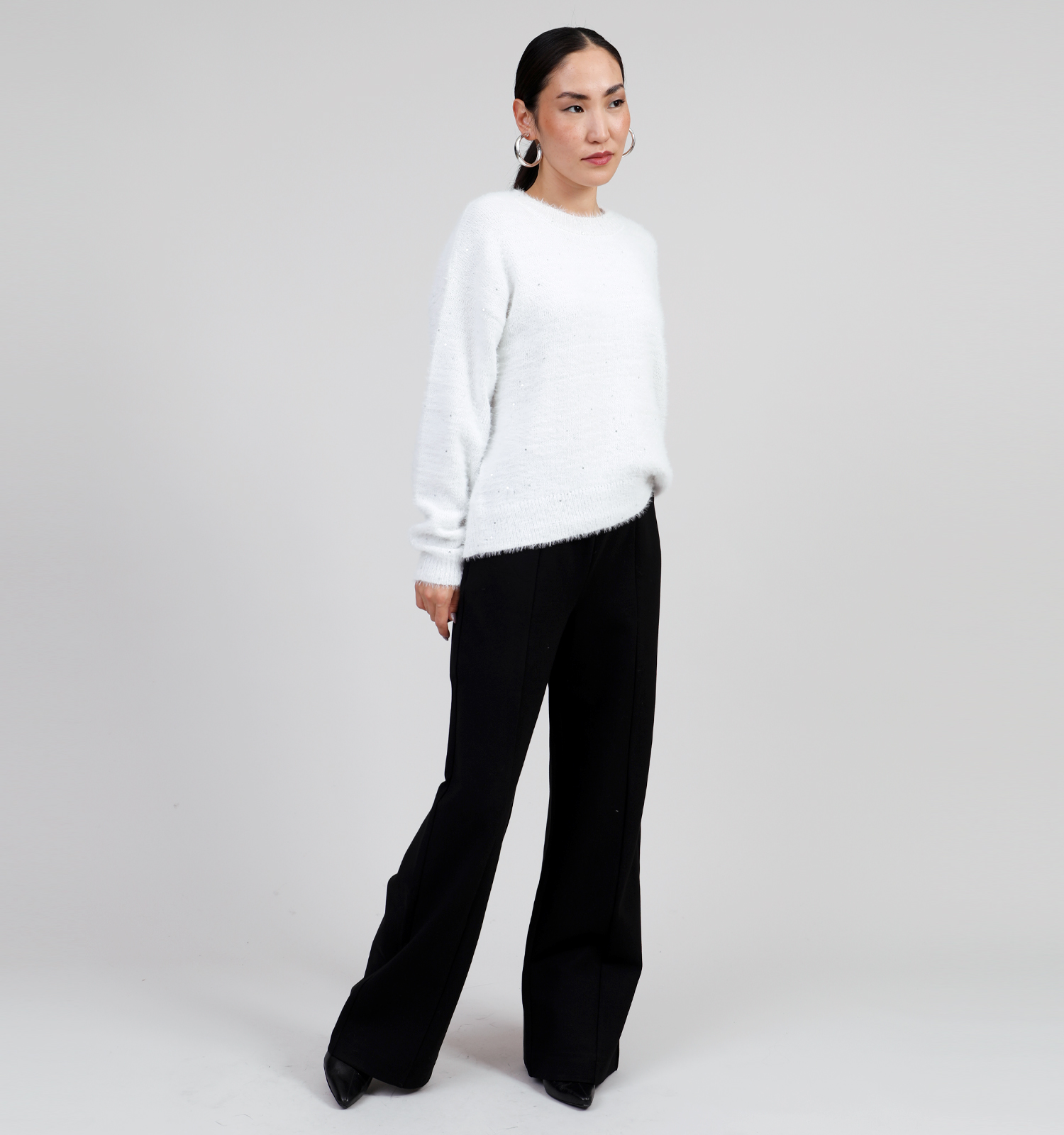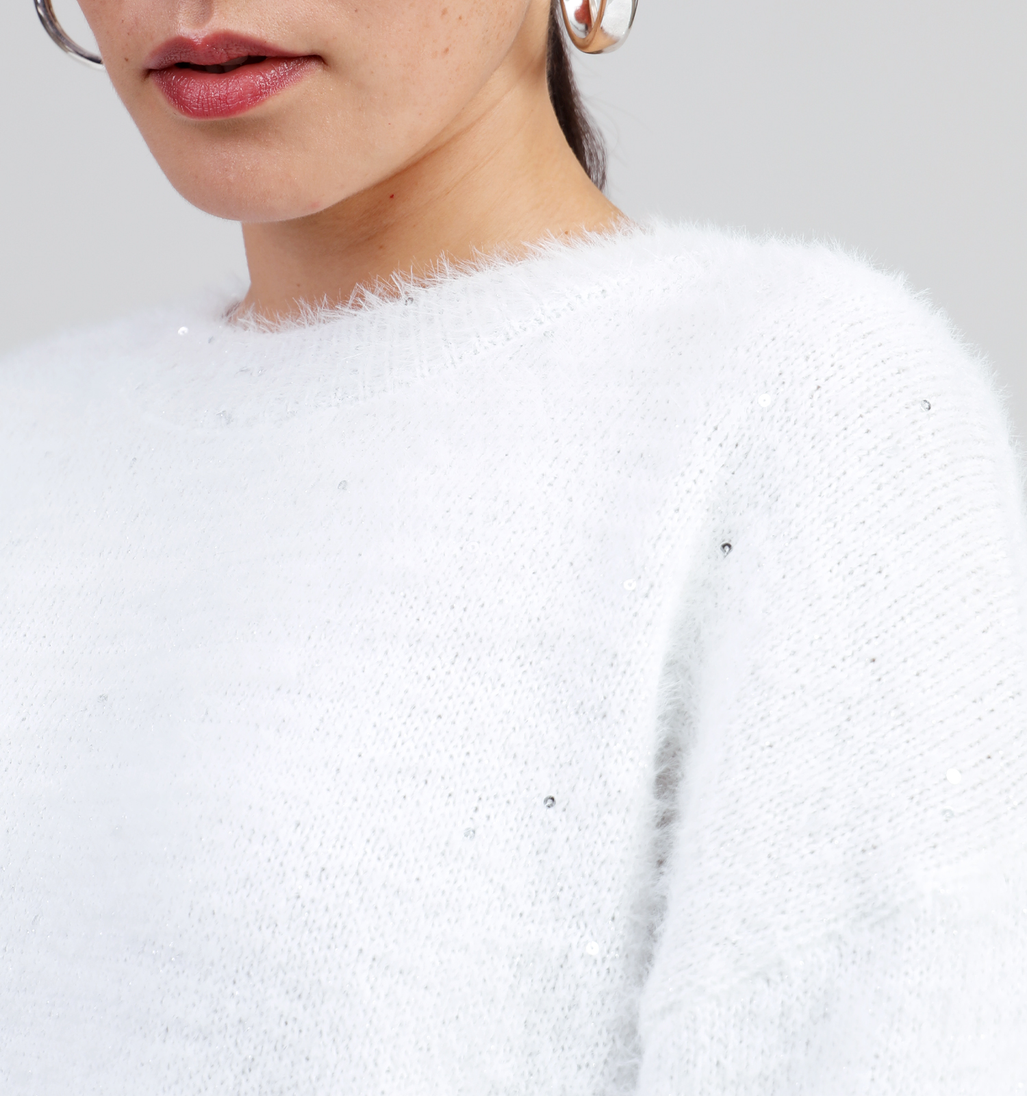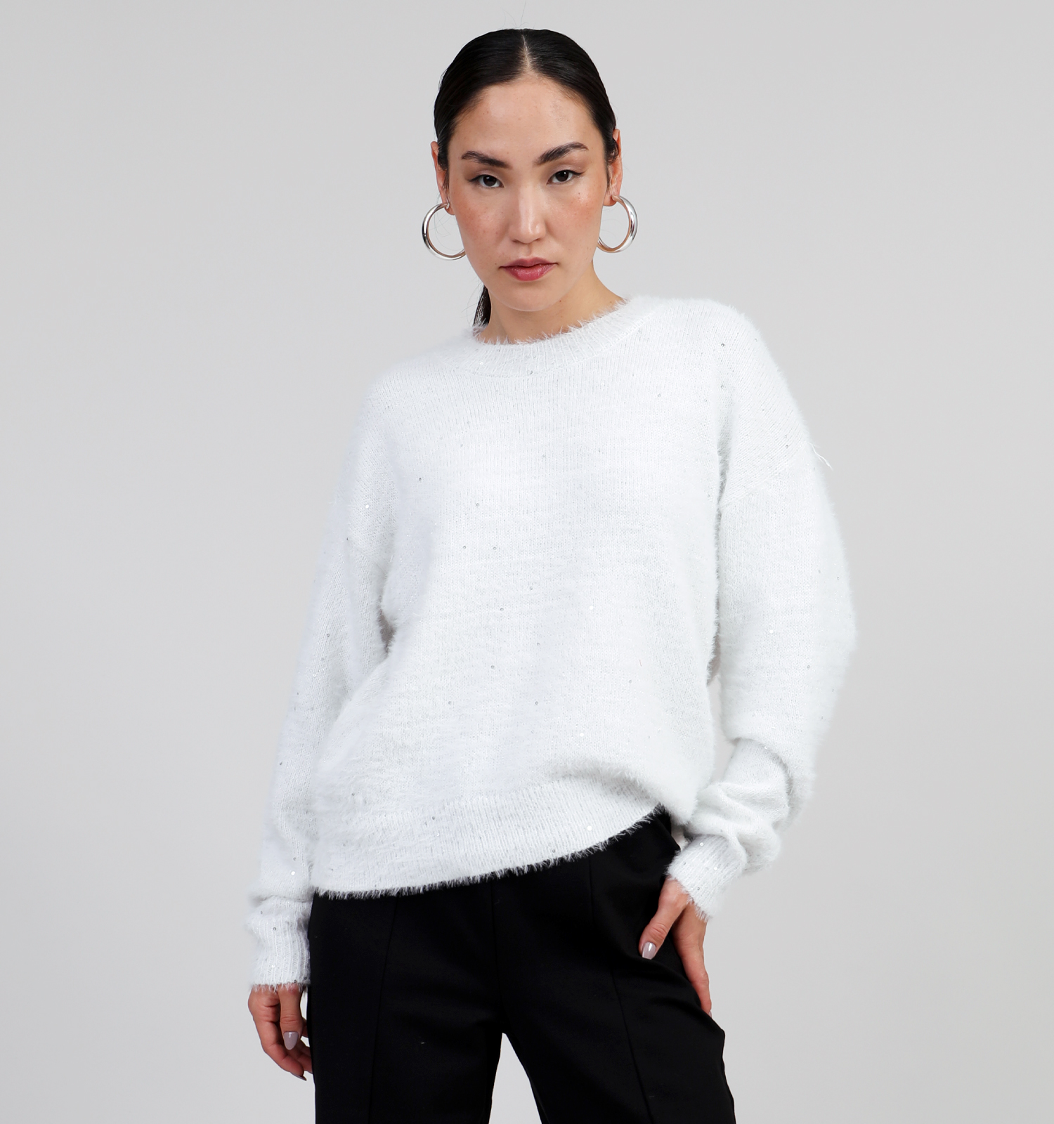 Ce pull pour femme en couleur blanc a un et manches longues.