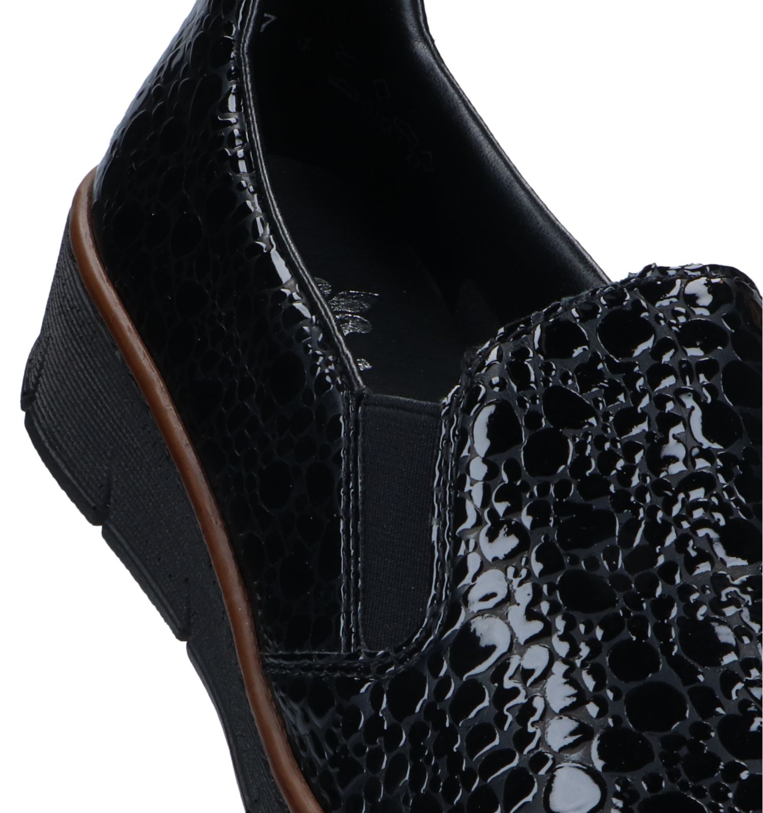Ces chaussures plates en noir sont fabriqué(e)s en simili cuir robuste et en simili cuir, textile souple à l'intérieur. Ces matériaux sont particulièrement légers, un antidote à la sensation reconnaissable de pieds lourds présente après un certain temps. La coupe ergonomique de ces chaussures plates Rieker pour femmes tient aussi compte du léger gonflement de tous les pieds en fin de journée. Ainsi, vous baignez dans un confort optimal toute la journée ! Ces chaussures plates Rieker pour femmes possède(e)s une fermeture à enfiler.