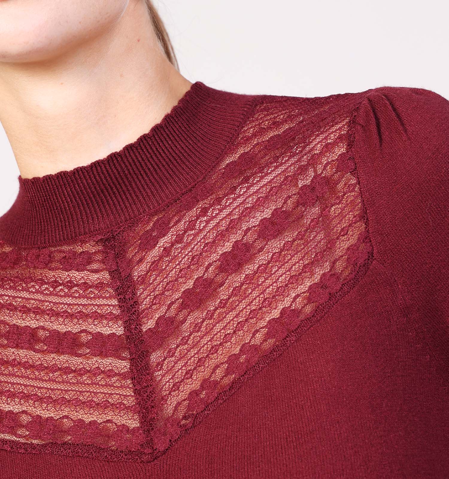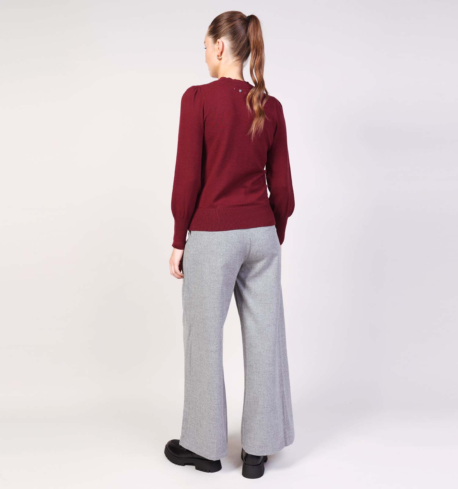 Deze damestrui in de kleur bordeaux heeft een opstaande kraag en lange mouwen.
