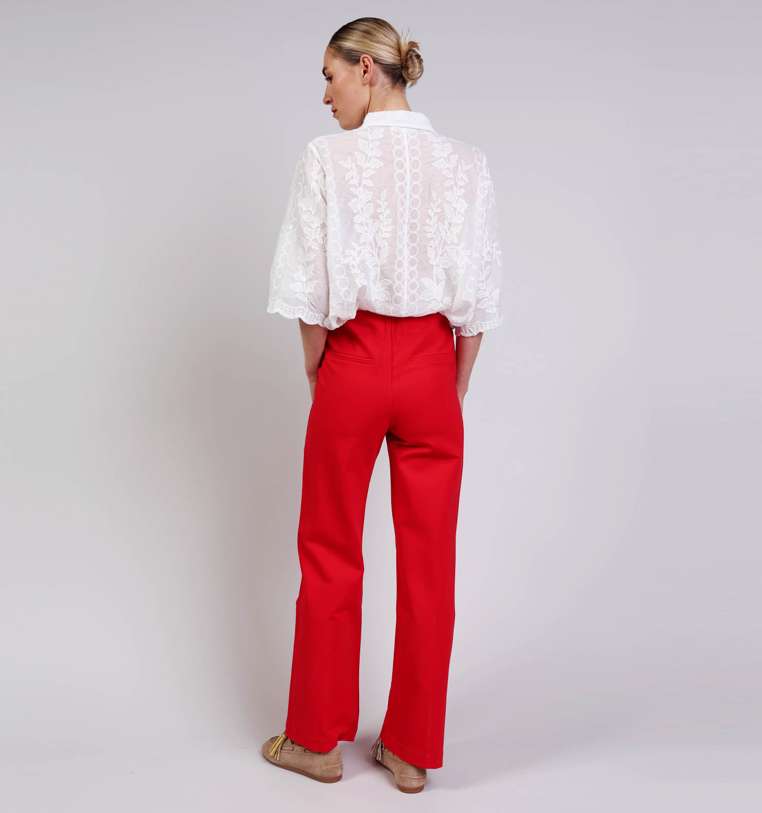 Maak je look compleet met minimalistische, witte sneakers of je favoriete pumps.