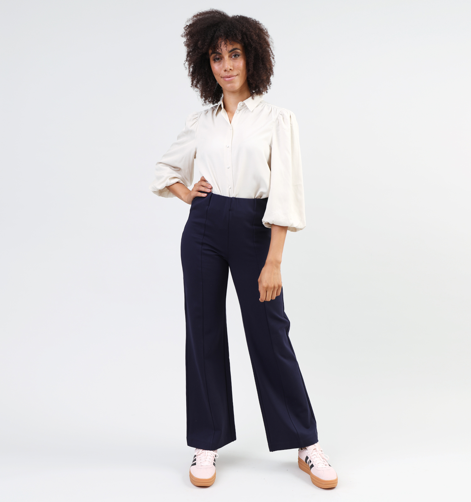 Deze geklede damesbroek heeft een hoge taille taillehoogte, en valt losvallend qua pasvorm.