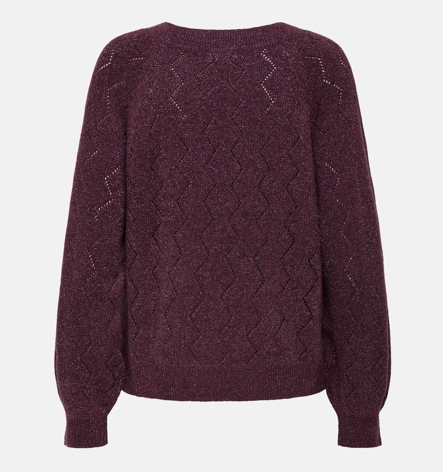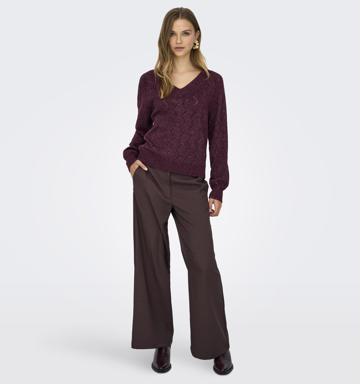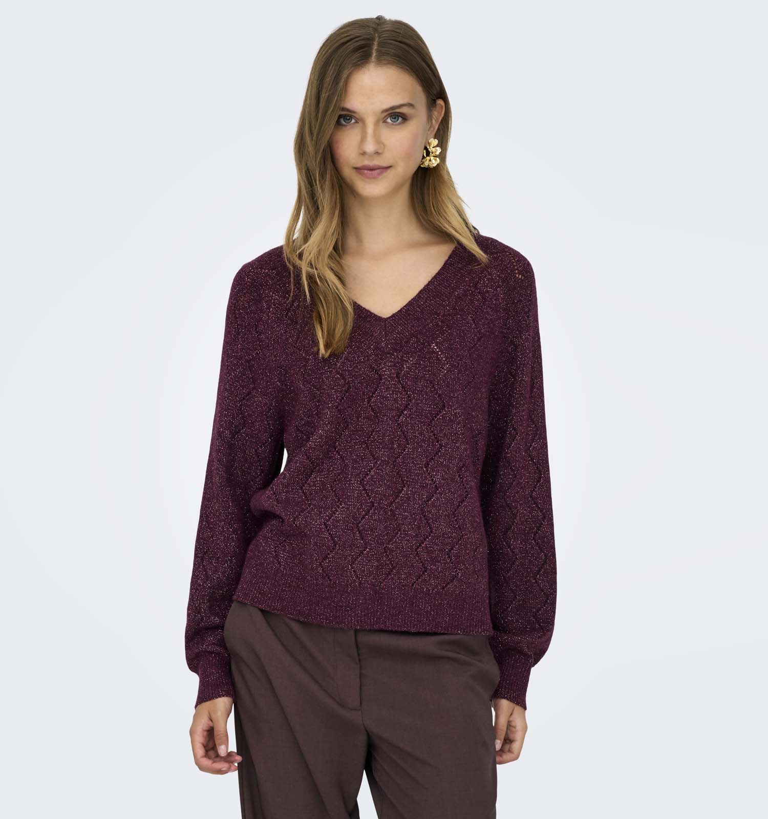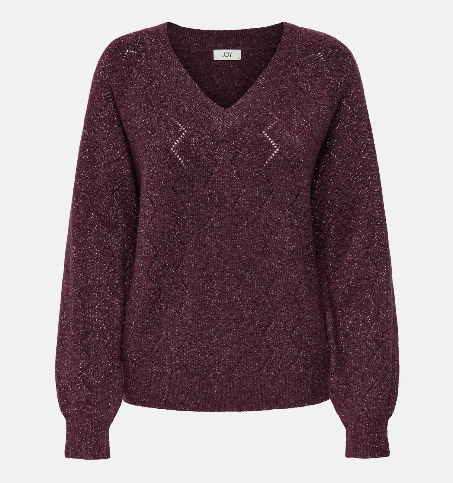 Deze damestrui in de kleur bordeaux heeft een v-hals en lange mouwen.
