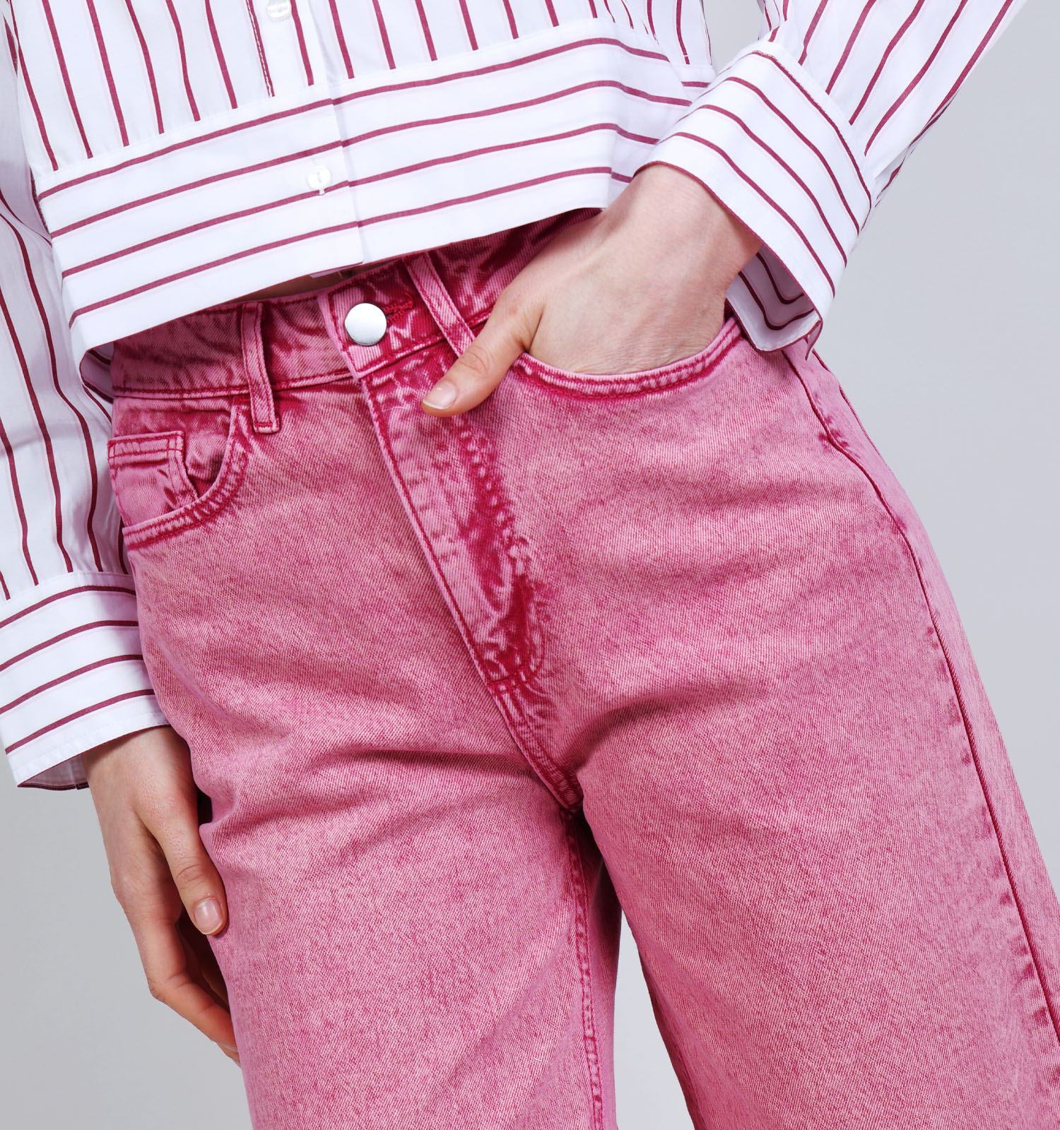 Was jouw nieuwe denim zoveel mogelijk binnestebuiten om de Roze kleur het mooist te houden. Volg daarnaast altijd de wasvoorschriften, die je op het wasetiket aan de broek kan vinden.