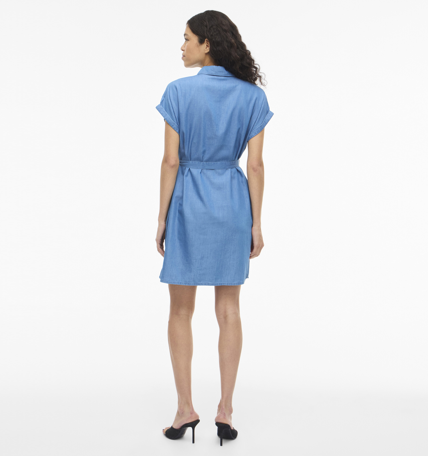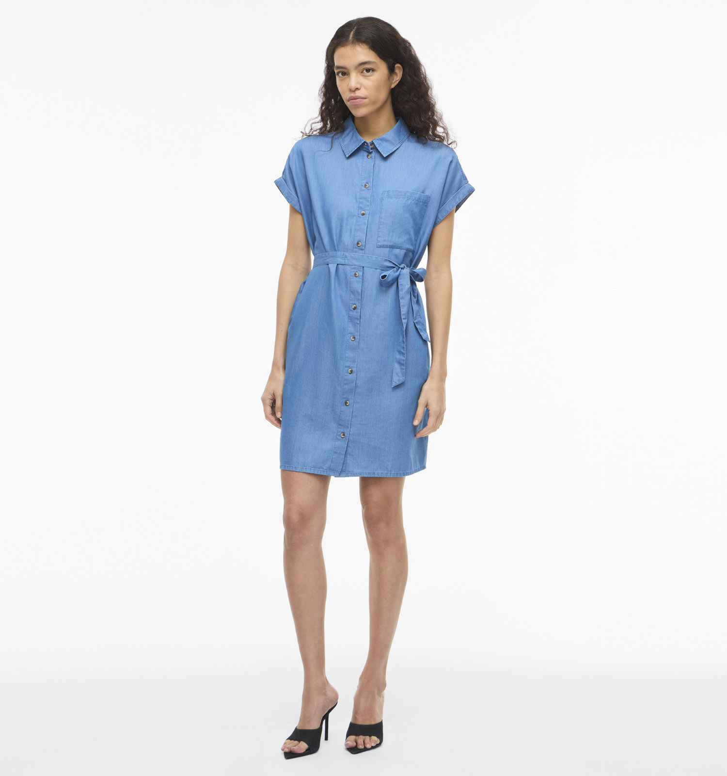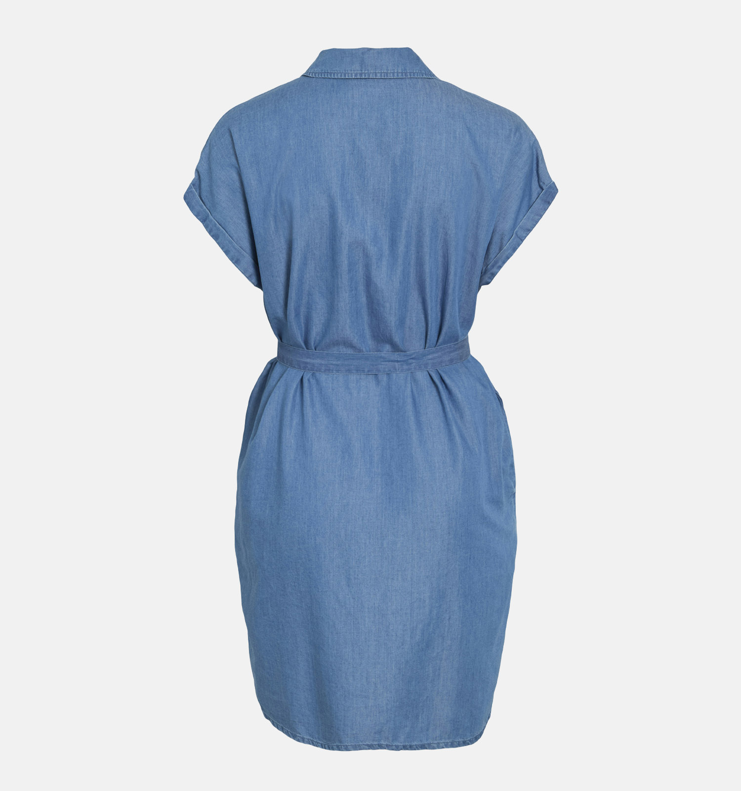 Deze blauwe hemdjurk van het merk Vila is een bestseller! Dat is geen verrassing: het silhouet is universeel flatterend en de prachtige blauwe kleur complimenteert elke teint. Het materiaal (katoen, lyocell-tencel) voelt zacht aan op de huid, wat altijd een welkom cadeau is! Goed om te weten: dit effen kleedje met korte mouwen heeft een pasvorm die recht valt.