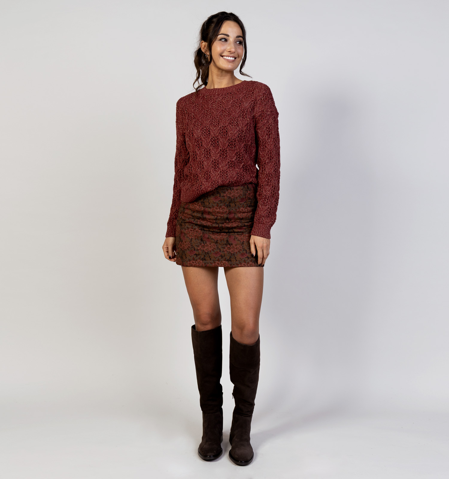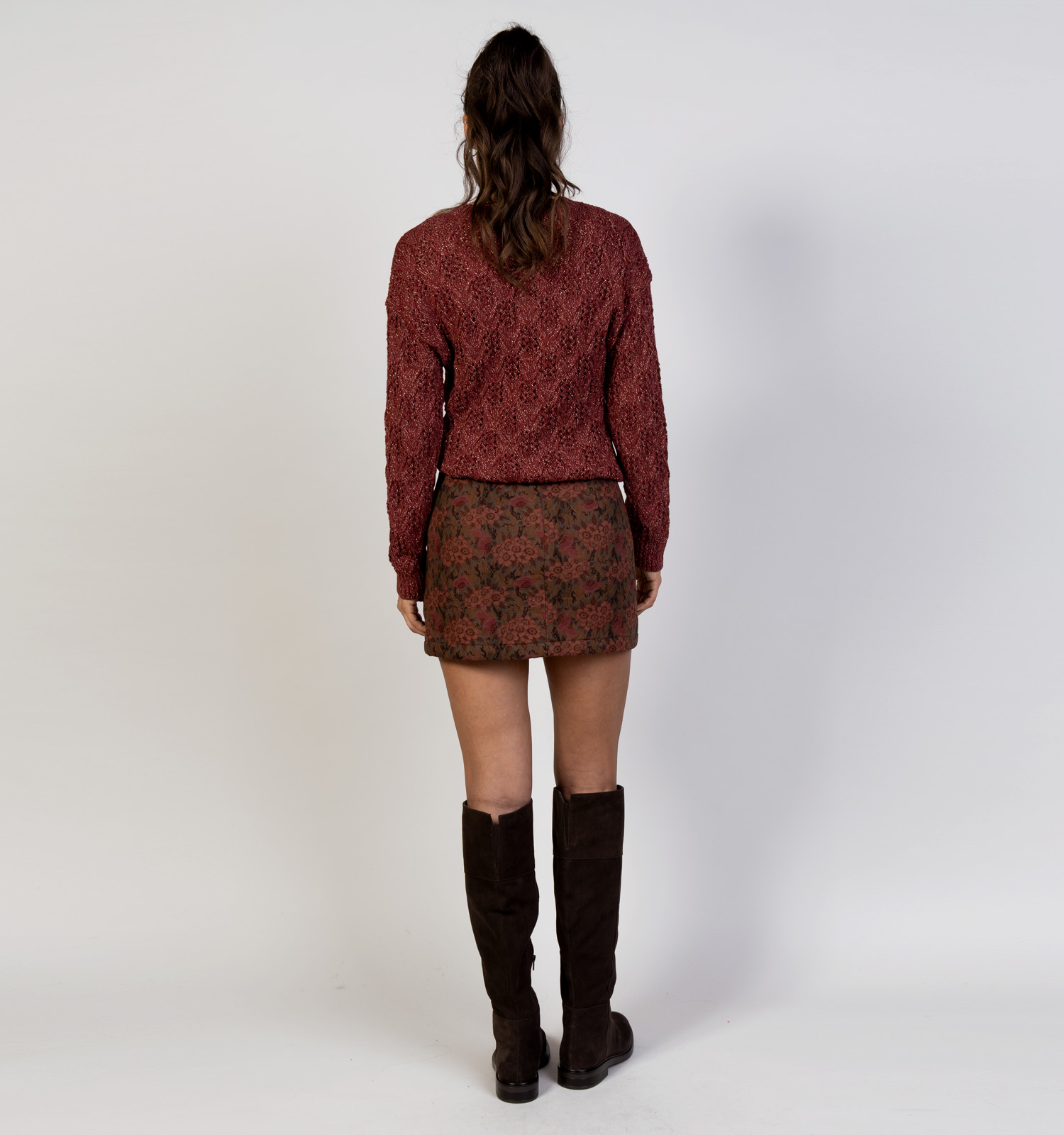 Boots onder een mini-rok zoals dit bruine exemplaar van The Korner kan ook: dat maakt de look wat stoerder. Combineer de boots met bruine sokken of sokken met een bruin detail voor een afgewerkte look! Style de sokken zodat ze net boven de boots uitkomen.