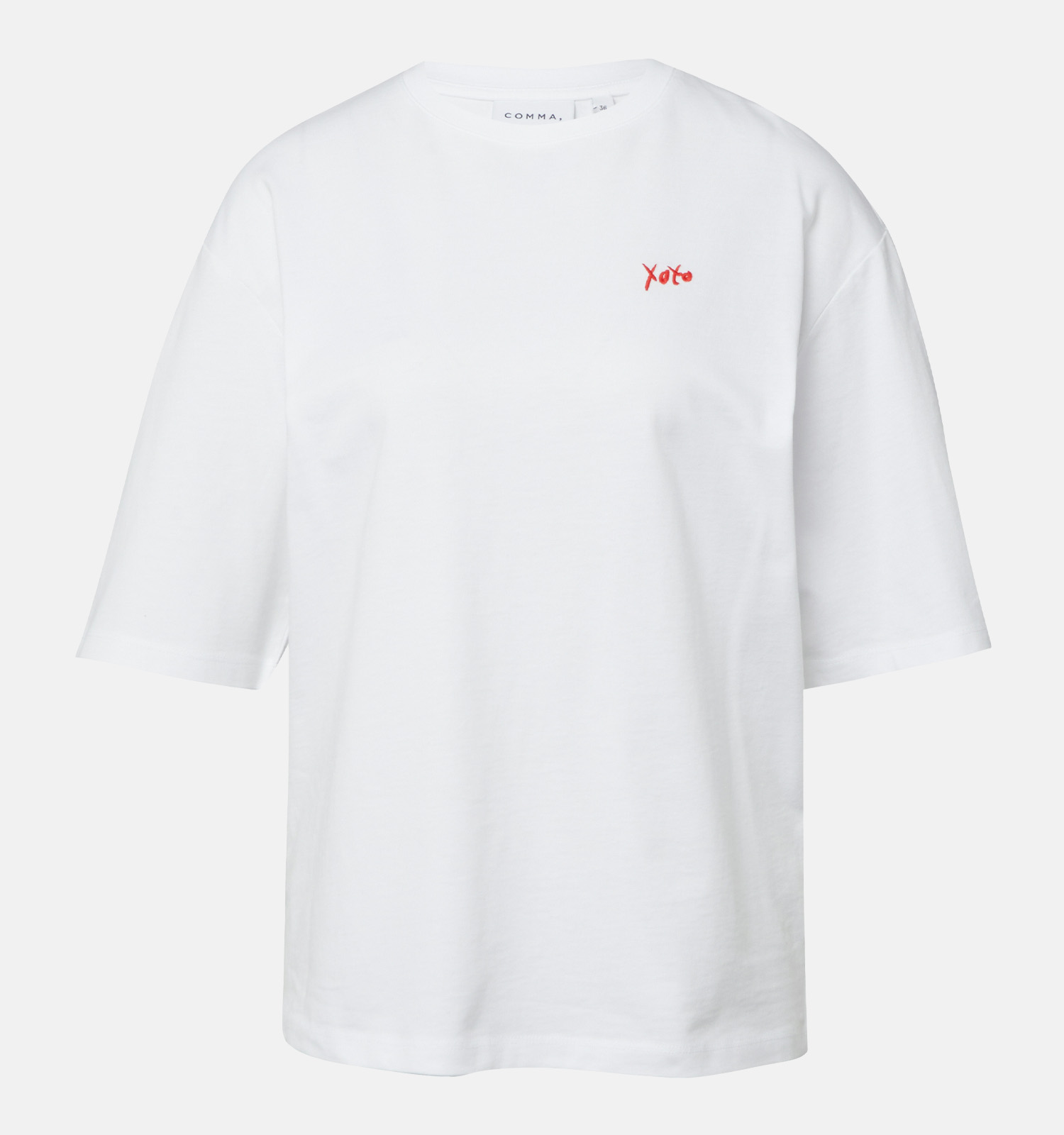 Deze T-shirt heeft halflange mouwen, waardoor je het hele jaar door van dit fijne exemplaar kan genieten! Ook interessant om te weten: dit comma-model valt recht qua pasvorm. Het staat dus ieder lichaamstype prachtig. Deze witte dames-T-shirt heeft een mooie ronde hals die je eventueel prachtig kan accentueren met je favoriete kettingen.