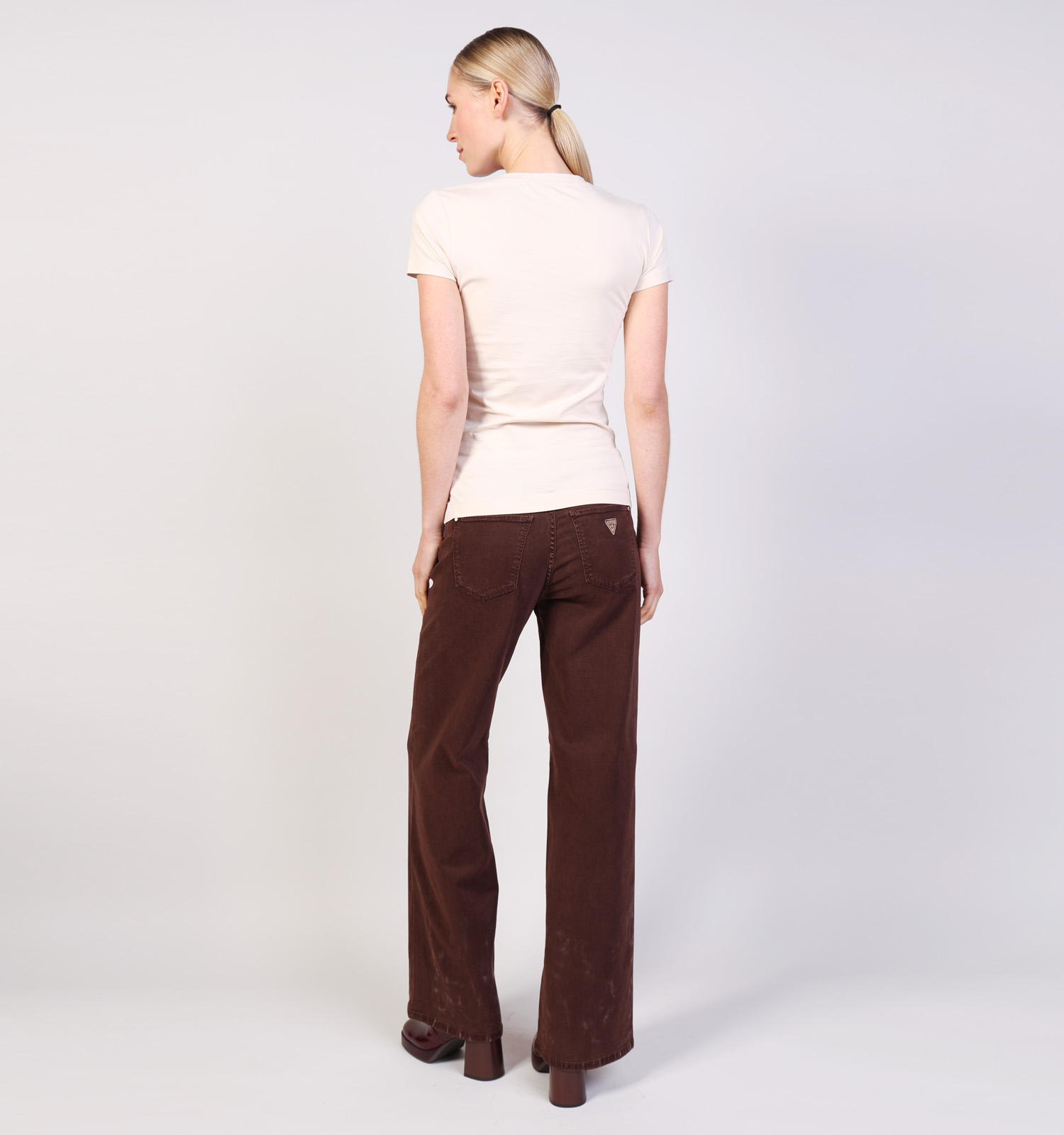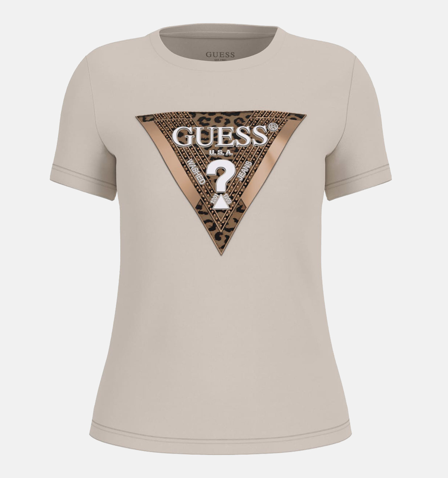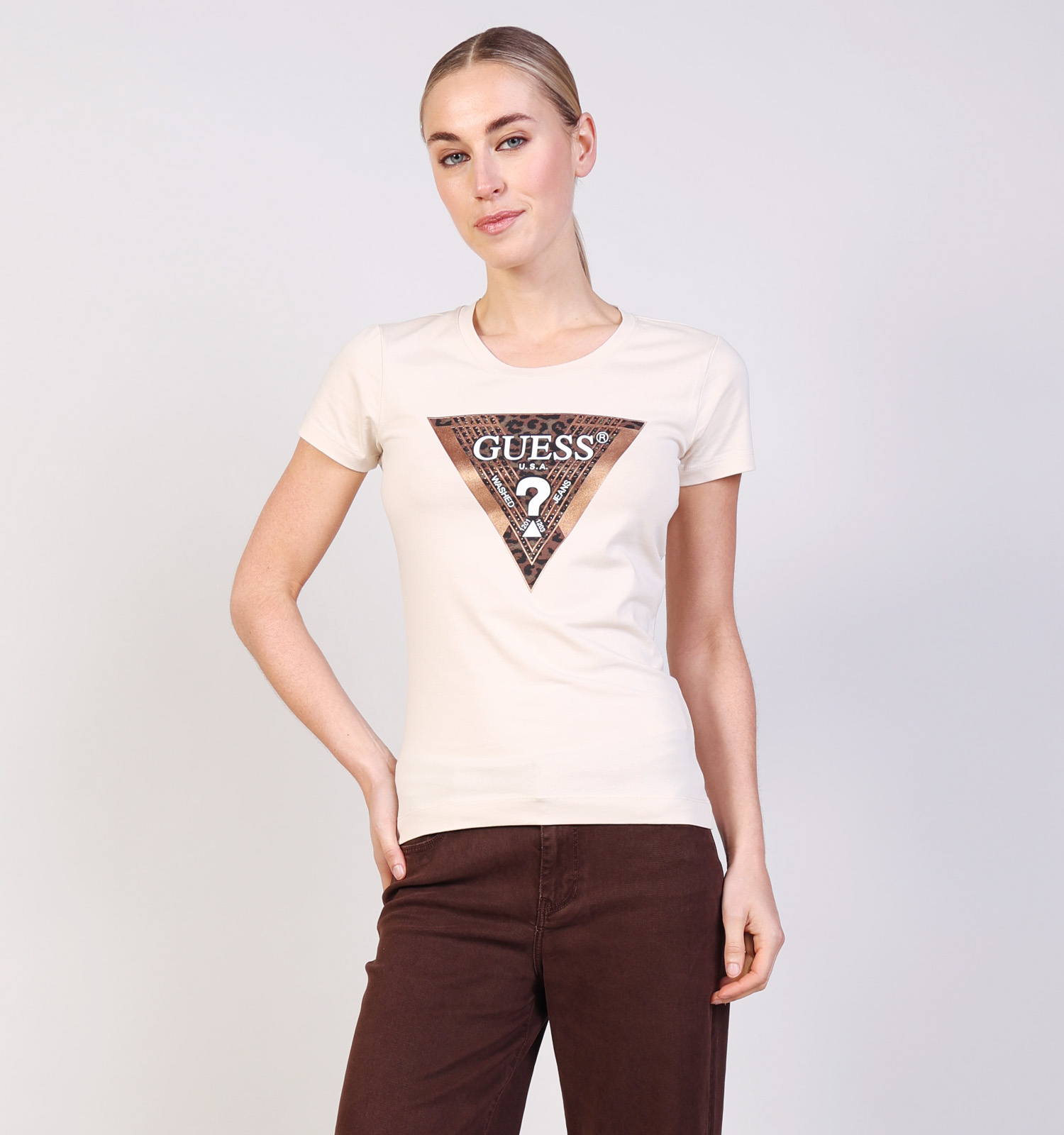 Deze T-shirt heeft korte mouwen, waardoor je het hele jaar door van dit fijne exemplaar kan genieten! Ook interessant om te weten: dit Guess-model valt recht qua pasvorm. Het staat dus ieder lichaamstype prachtig. Deze beige dames-T-shirt heeft een mooie ronde hals die je eventueel prachtig kan accentueren met je favoriete kettingen.