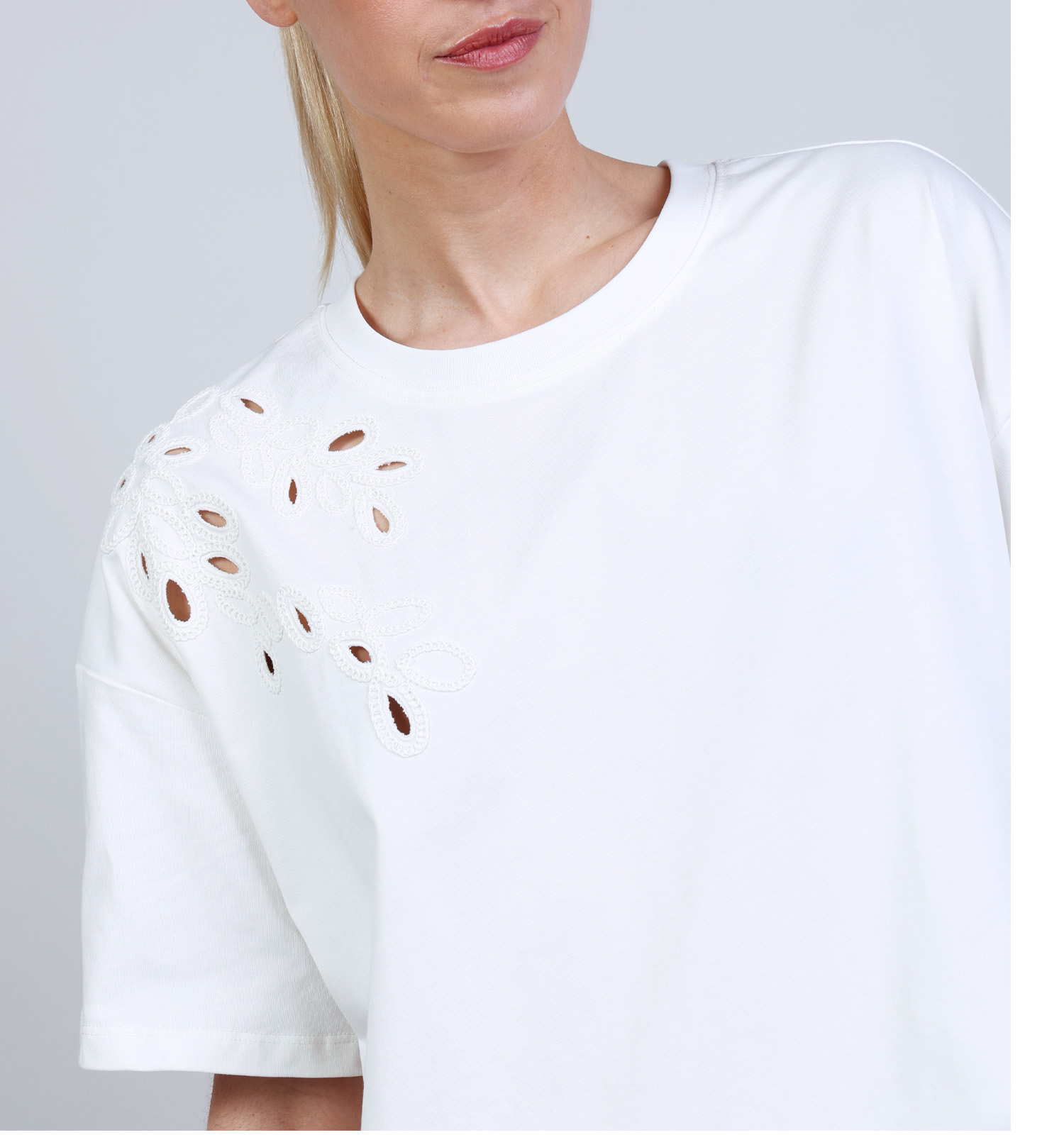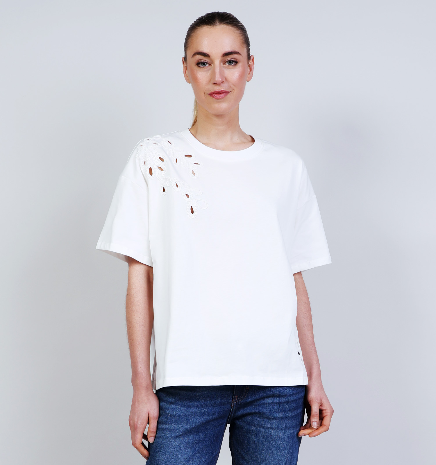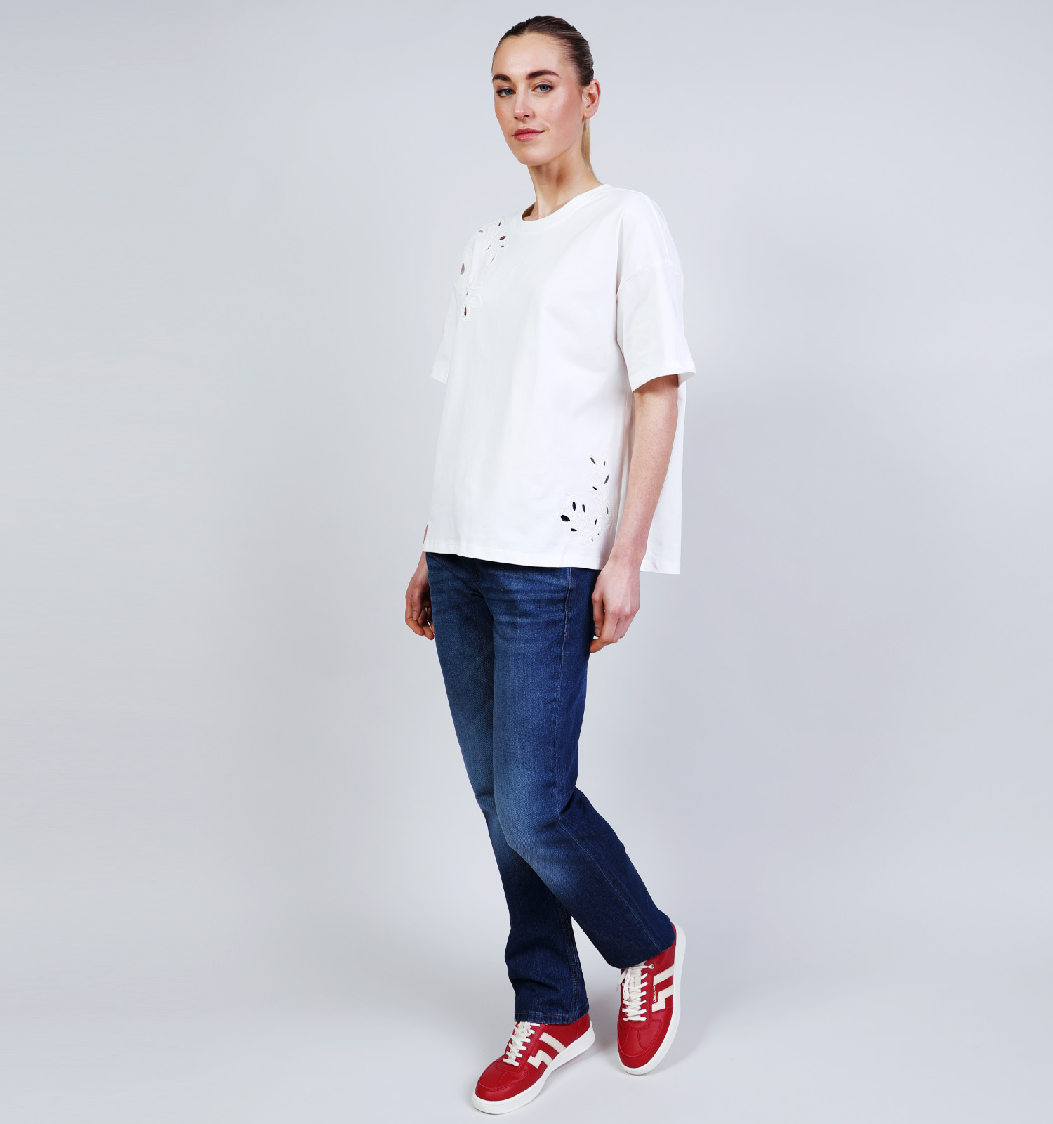 Deze T-shirt heeft korte mouwen, waardoor je het hele jaar door van dit fijne exemplaar kan genieten! Ook interessant om te weten: dit Orfeo-model valt recht qua pasvorm. Het staat dus ieder lichaamstype prachtig. Deze witte dames-T-shirt heeft een mooie ronde hals die je eventueel prachtig kan accentueren met je favoriete kettingen.