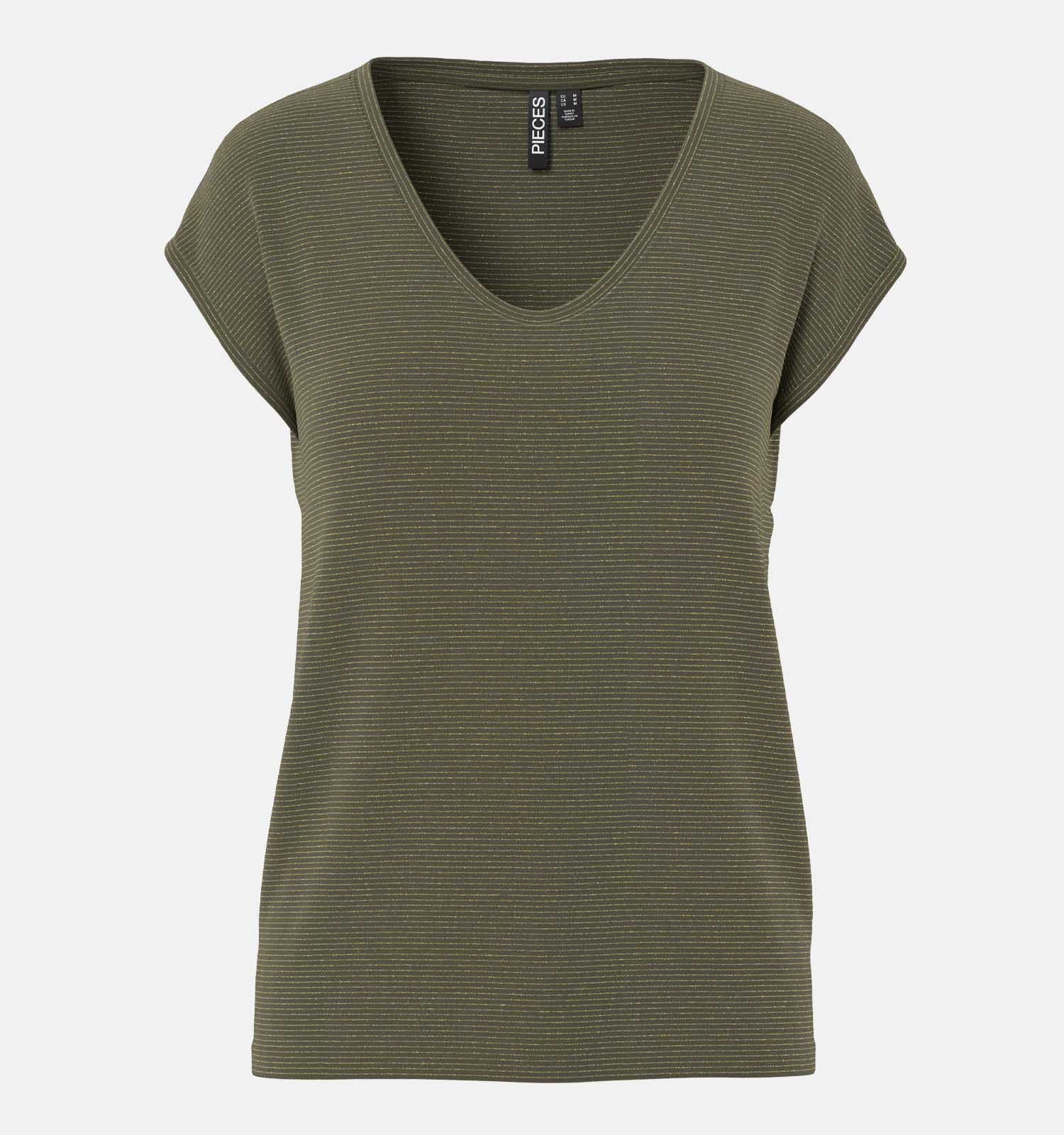 Deze T-shirt heeft korte mouwen, waardoor je het hele jaar door van dit fijne exemplaar kan genieten! Ook interessant om te weten: dit Pieces-model valt recht qua pasvorm. Het staat dus ieder lichaamstype prachtig. Deze groene dames-T-shirt heeft een mooie v-hals die je eventueel prachtig kan accentueren met je favoriete kettingen.