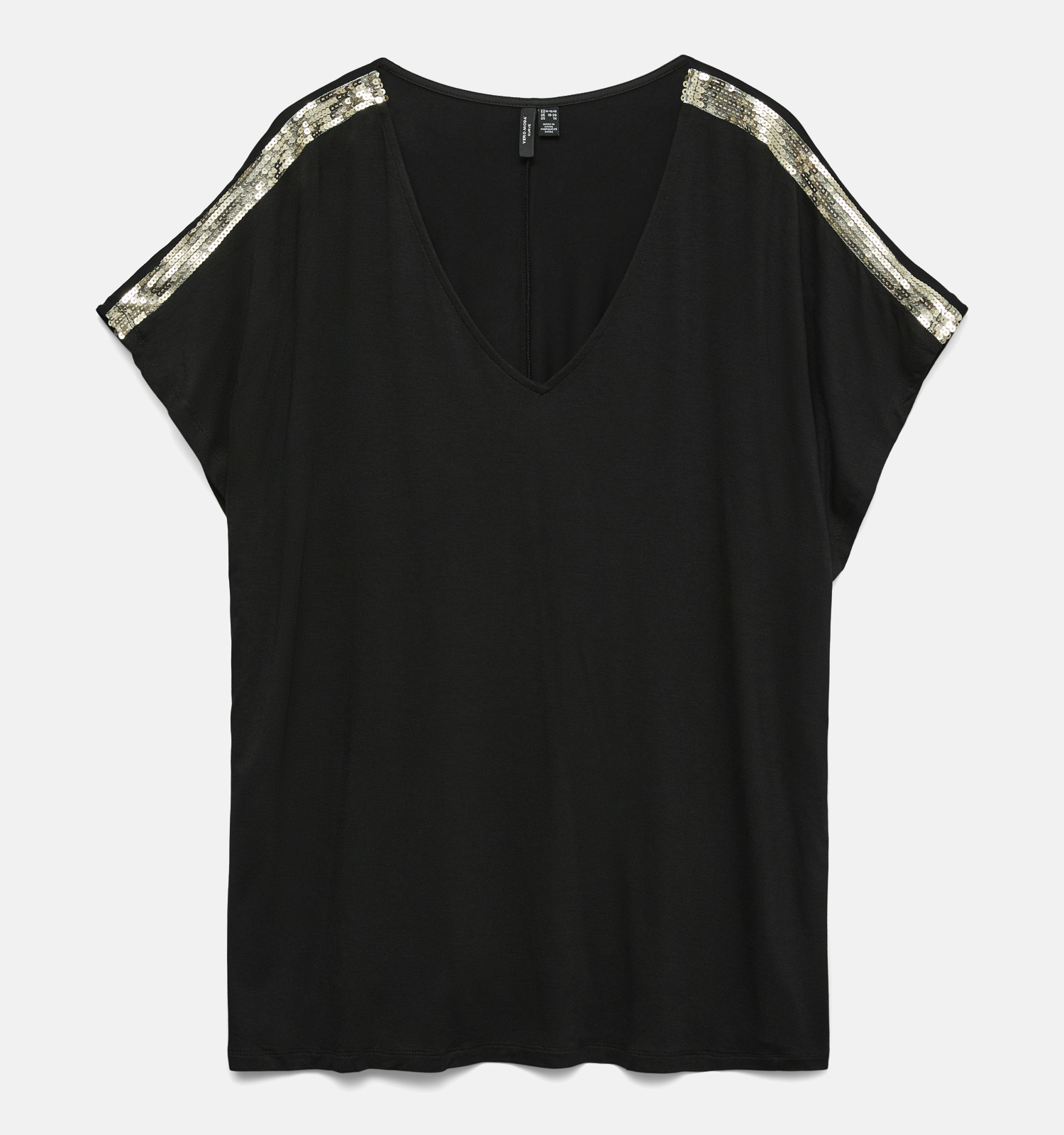 Deze T-shirt heeft korte mouwen, waardoor je het hele jaar door van dit fijne exemplaar kan genieten! Ook interessant om te weten: dit Vero Moda Curve-model valt recht qua pasvorm. Het staat dus ieder lichaamstype prachtig. Deze zwarte dames-T-shirt heeft een mooie v-hals die je eventueel prachtig kan accentueren met je favoriete kettingen.