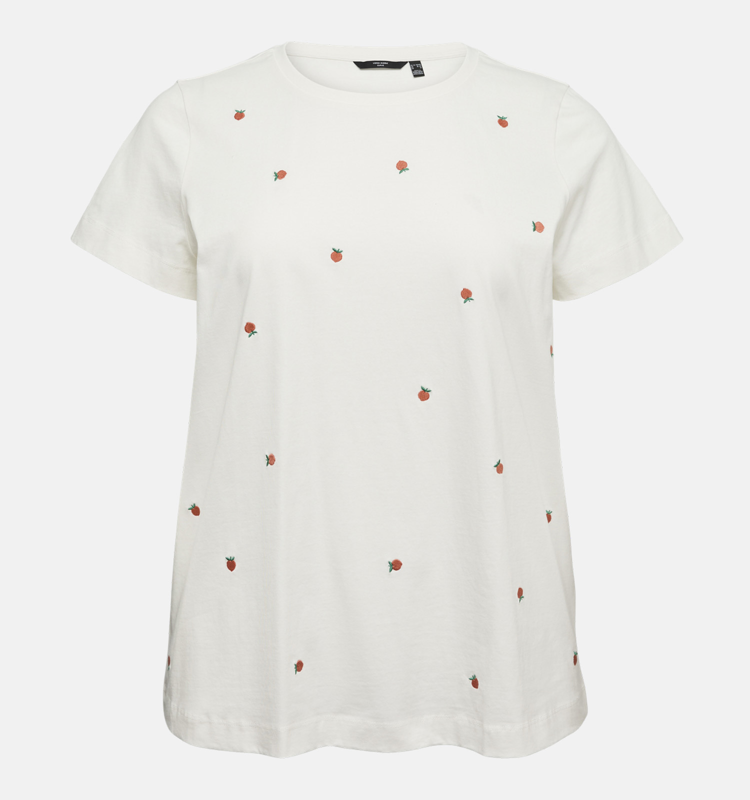Deze T-shirt heeft korte mouwen, waardoor je het hele jaar door van dit fijne exemplaar kan genieten! Ook interessant om te weten: dit Vero Moda Curve-model valt recht qua pasvorm. Het staat dus ieder lichaamstype prachtig. Deze witte dames-T-shirt heeft een mooie ronde hals die je eventueel prachtig kan accentueren met je favoriete kettingen.