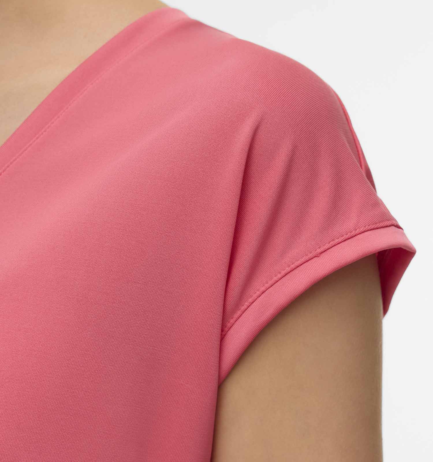 Deze T-shirt heeft korte mouwen, waardoor je het hele jaar door van dit fijne exemplaar kan genieten! Ook interessant om te weten: dit Vero Moda-model valt recht qua pasvorm. Het staat dus ieder lichaamstype prachtig. Deze roze dames-T-shirt heeft een mooie v-hals die je eventueel prachtig kan accentueren met je favoriete kettingen.