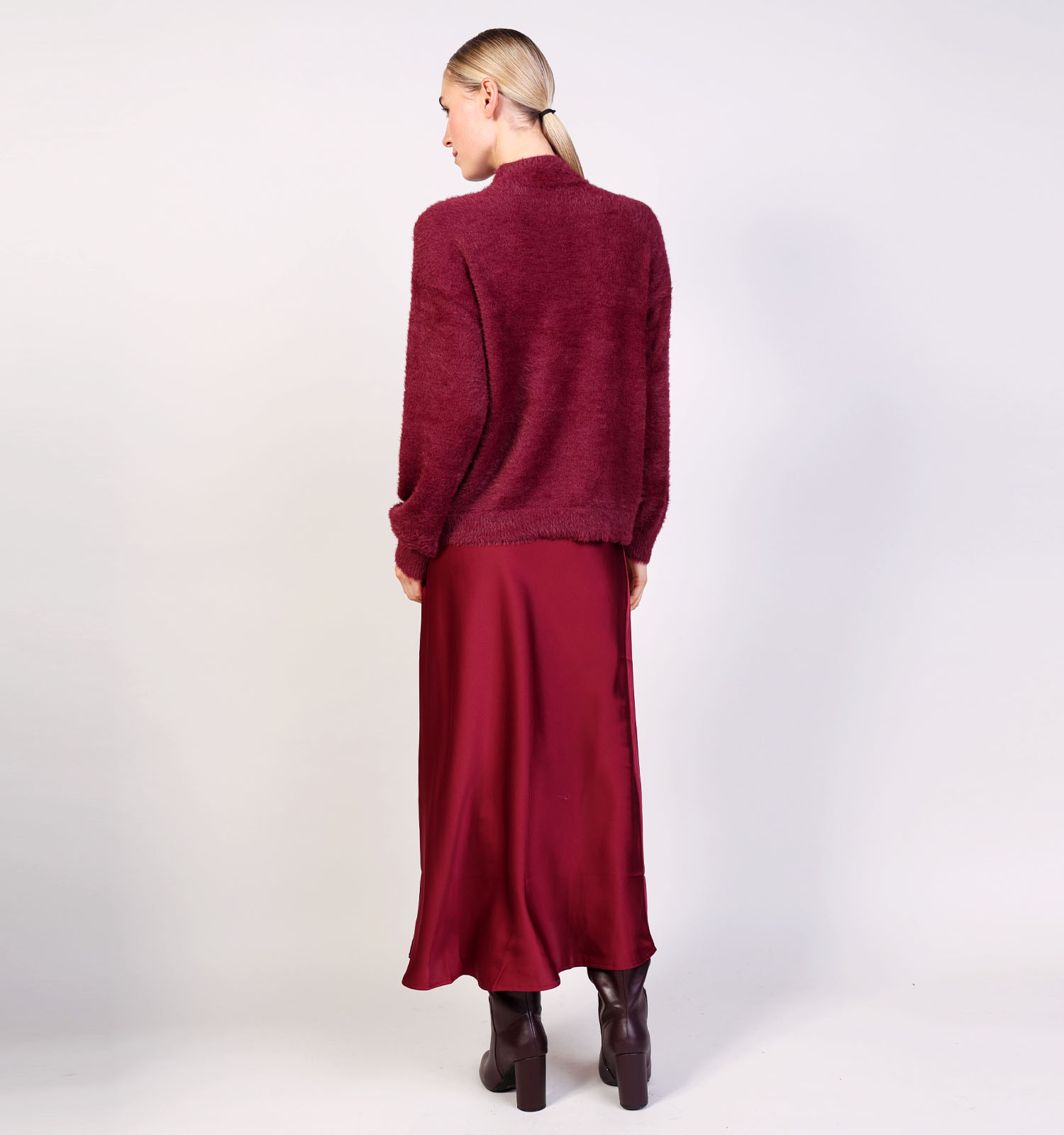 Deze damestrui in de kleur bordeaux heeft een opstaande kraag en lange mouwen.