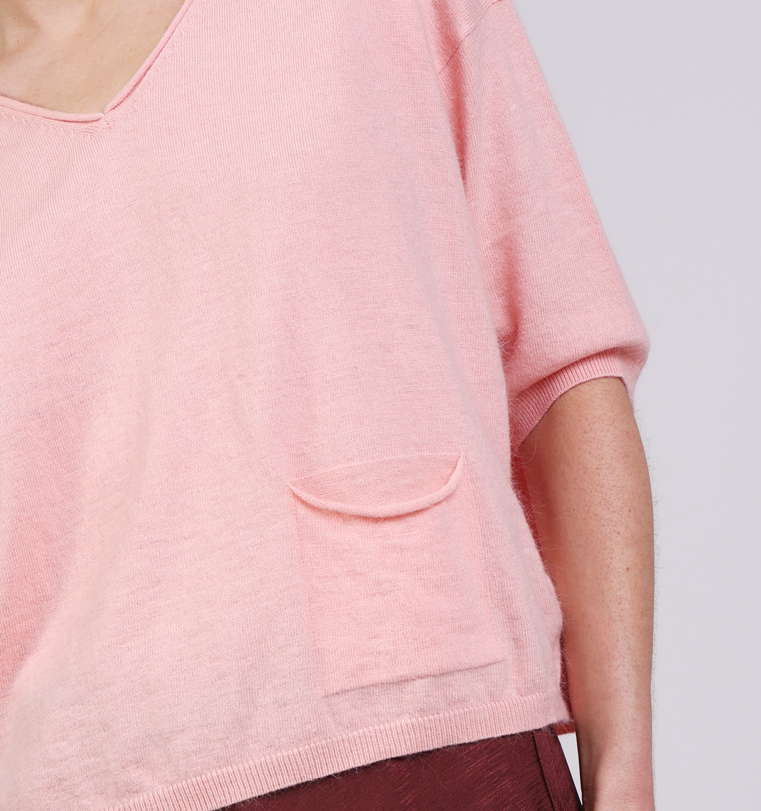 Deze damestrui in de kleur roze heeft een v-hals en halflange mouwen.