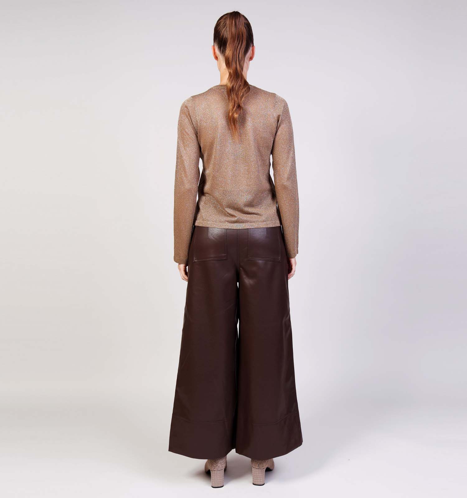 Deze damestrui in de kleur bruin heeft een ronde hals en lange mouwen.
