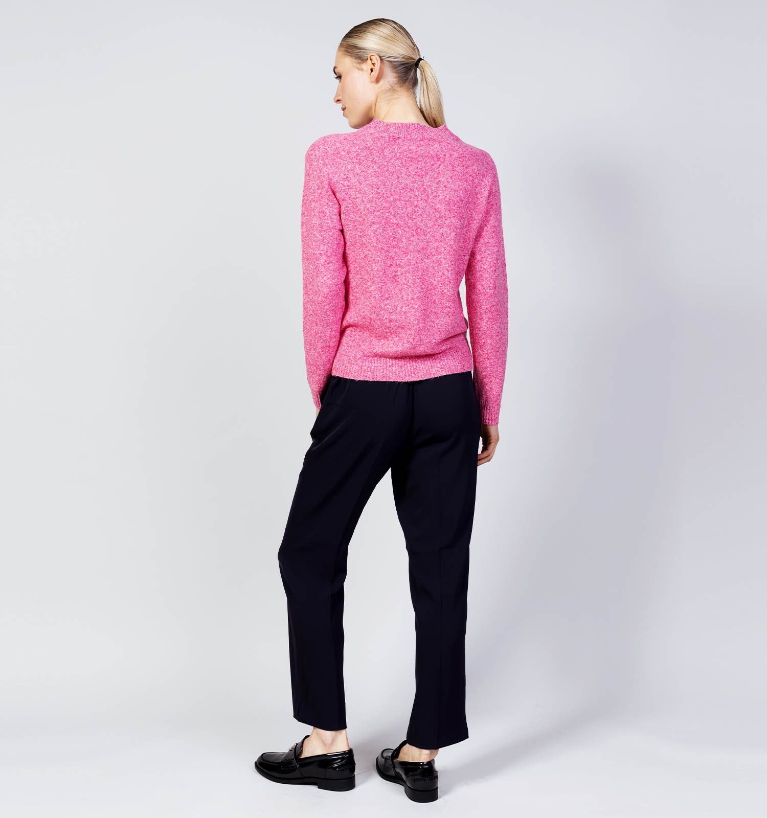 Deze damestrui in de kleur roze heeft een ronde hals en lange mouwen.
