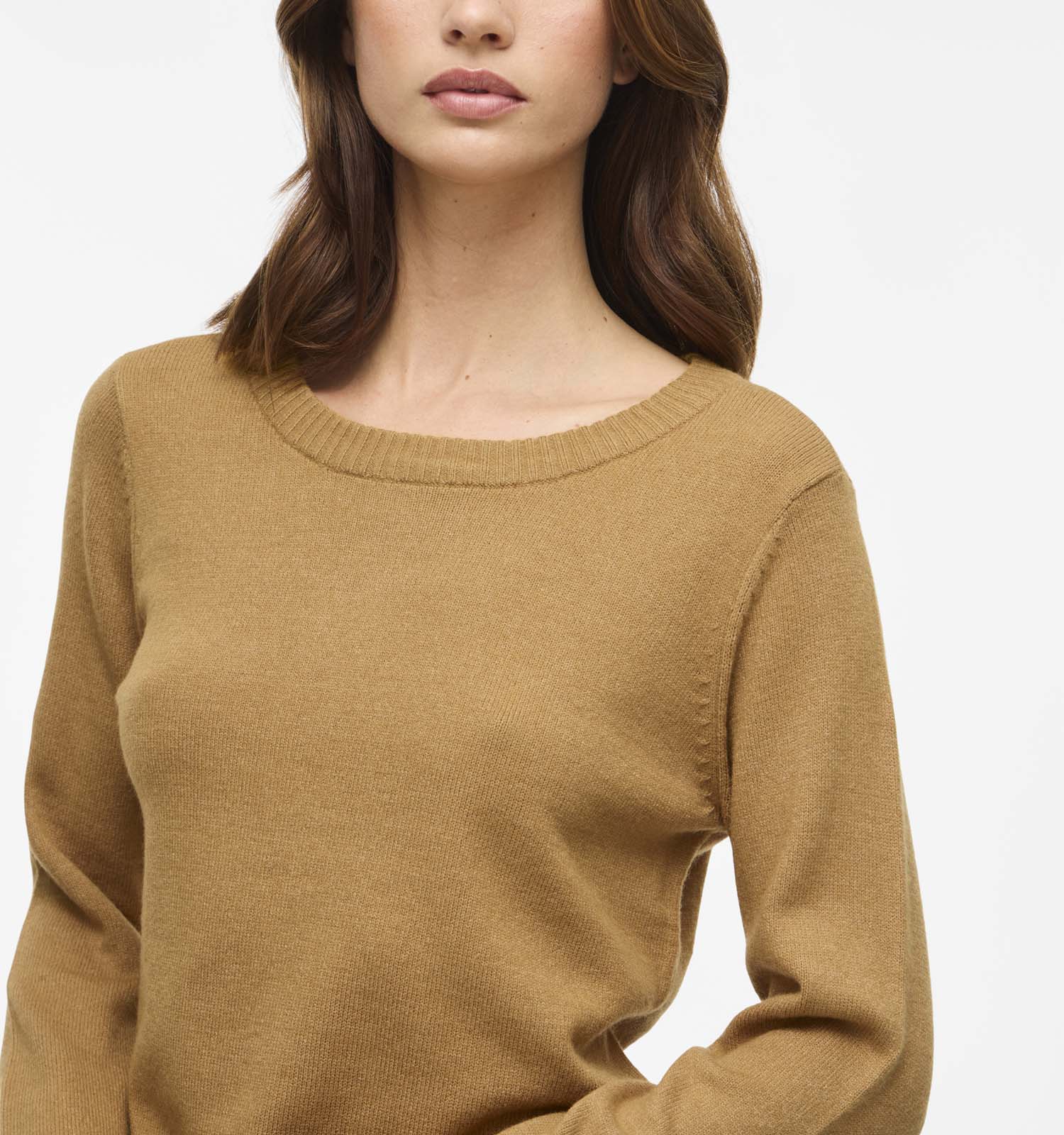Deze damestrui in de kleur bruin heeft een ronde hals en lange mouwen.